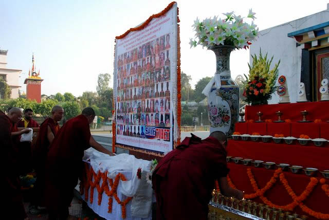 On the auspicious full moon day of the 10th Lunar month of year of the Water Dragon (November 28, 2012), the Mindrolling Monastery held a prayer ceremony to commemorate the selfless sacrifice of the 90 brave Tibetans who, through self-immolation, laid down their lives for Tibet’s freedom and the return of His Holiness the Dalai Lama to Tibet. The prayer ceremony was presided over by H.E. Penam Rinpoche, H.E. Jetsün Khandro Rinpoche and Ven. Tulku Lhundrub Tengay of Mindrolling.