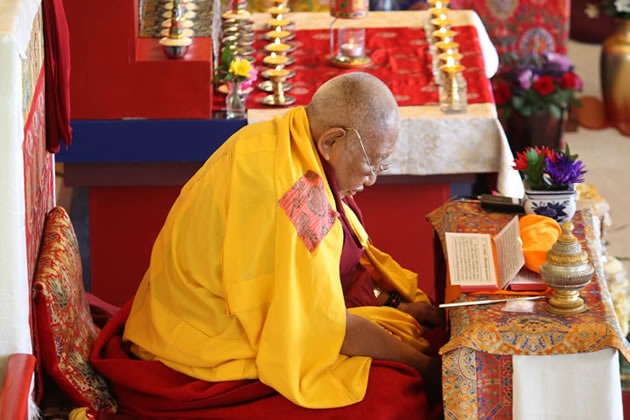 Important transmissions have included the Kama transmission bestowed by Kyabje Taklung Tsetrul Rinpoche at Mindrolling Monastery during the winter of 1997-1998, the Minling Chokhör bestowed by Kyabje Trulshik Rinpoche in 2007 at Mindrolling, the Rinchen Terdzö bestowed by Kyabje Tsetrul Rinpoche during the winter of 2008-09 at Mindrolling, and the Künzang Gongpa Zangthal bestowed by Kyabje Tsetrul Rinpoche at Mindrolling Lotus Garden in the United States in the autumn of 2010.