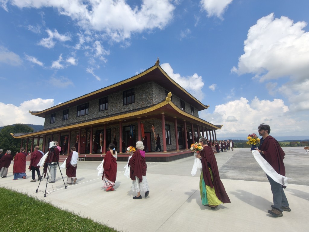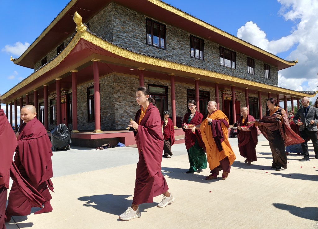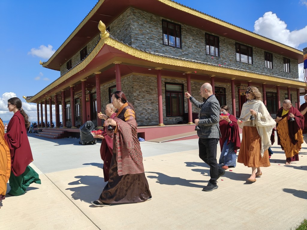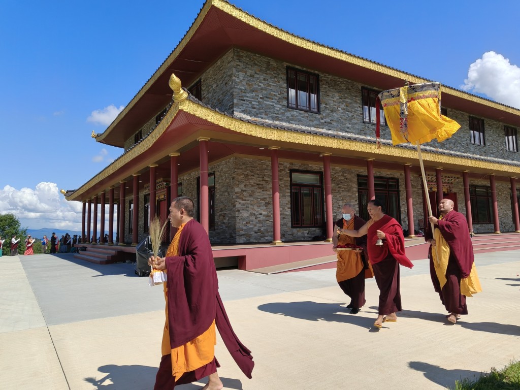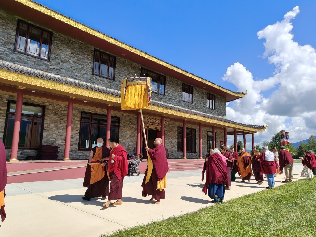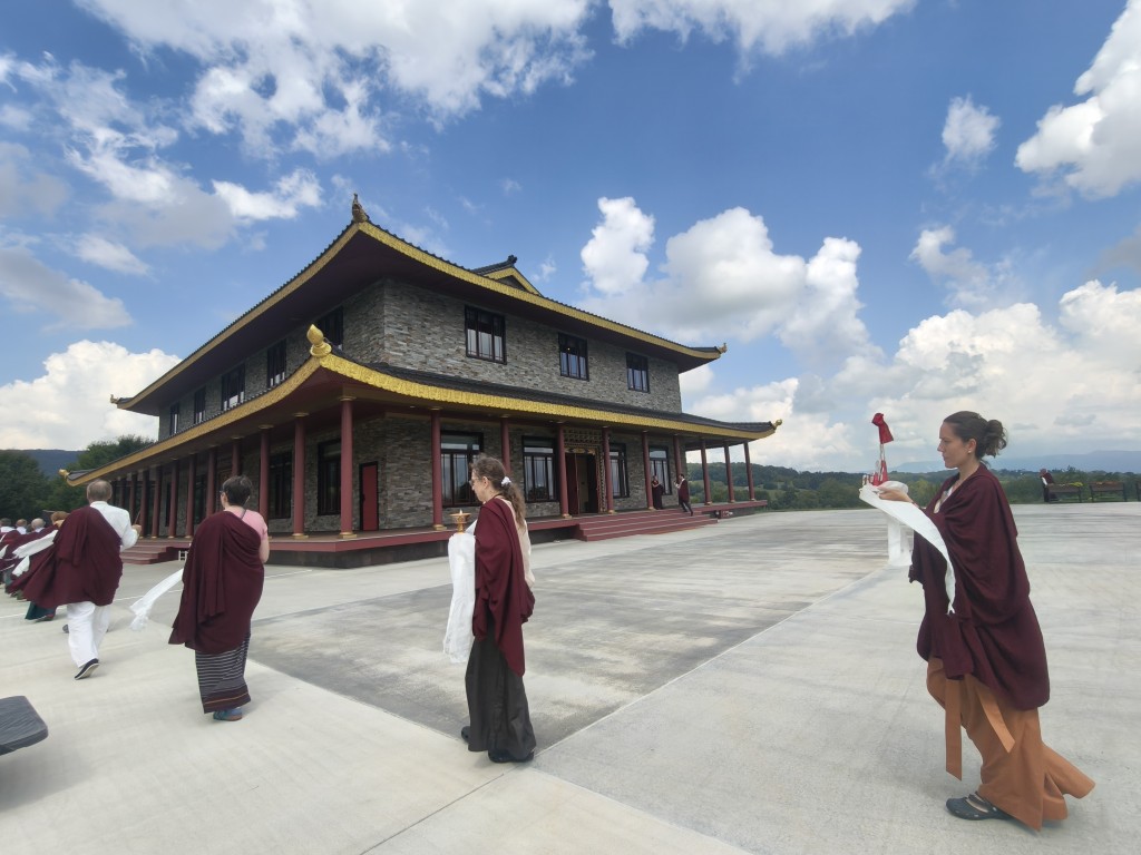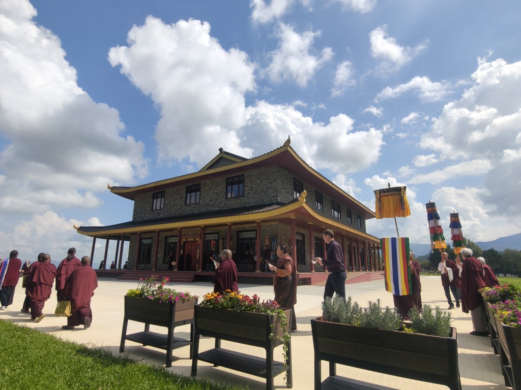 In the summer of 2025 at Mindrolling Lotus Garden, the long-awaited consecration of the newly built temple, Mindrol Gatsal, took place. Mindrolling Lotus Garden sangha members gathered from around the world to take part in this wonderful occasion.  The process began with the elaborate po chog, the ritual for transferring the sacred contents, blessings, and siddhis from the old shrine room to the new temple.  The po chog was held on the 16th of August, 2025. The ritual centers around the melong, or mirror, that serves as the physical support to gather the jnanasattvas and their blessings that the old shrine room has been imbued with over years of practice, studies, teachings, and transmissions.  The melong is then covered in cloth in the colors of the Five Buddha Families and brought in a ceremonial procession from the old temple into the new temple.