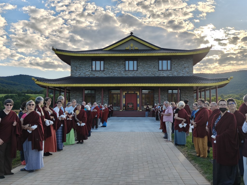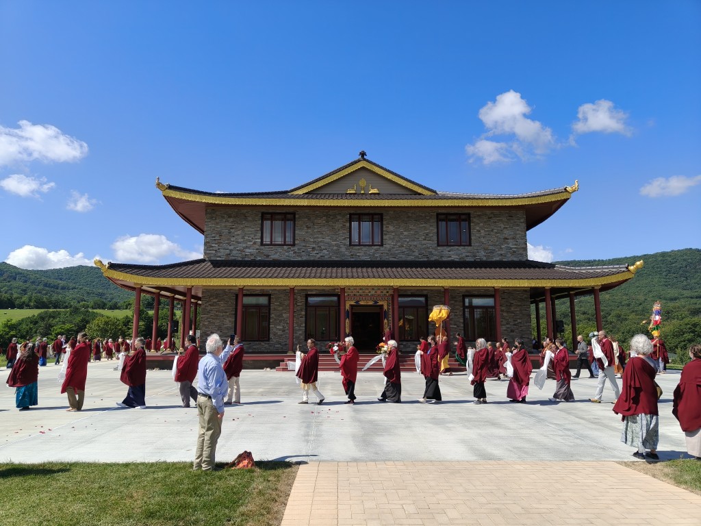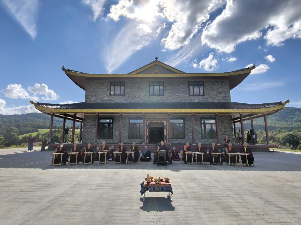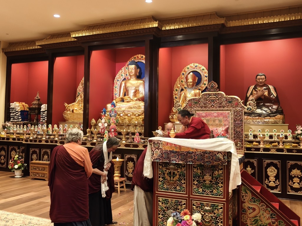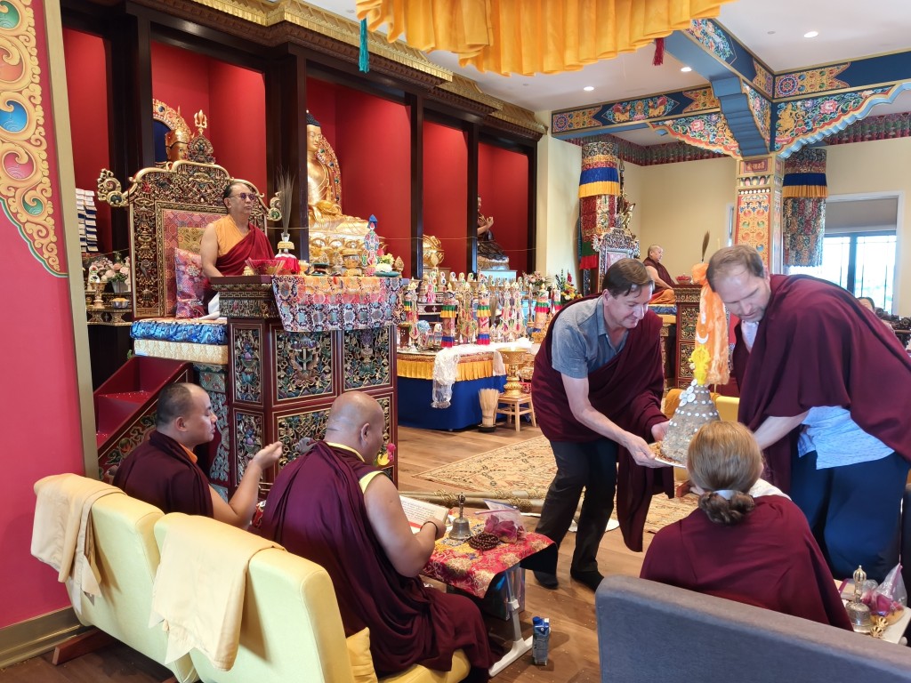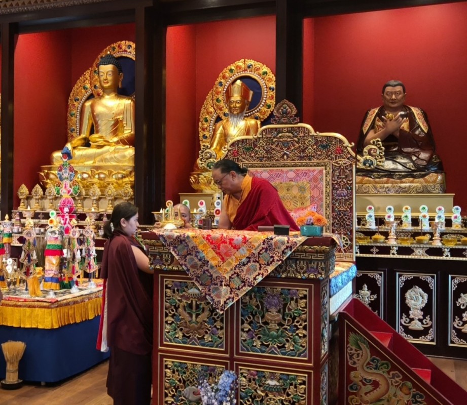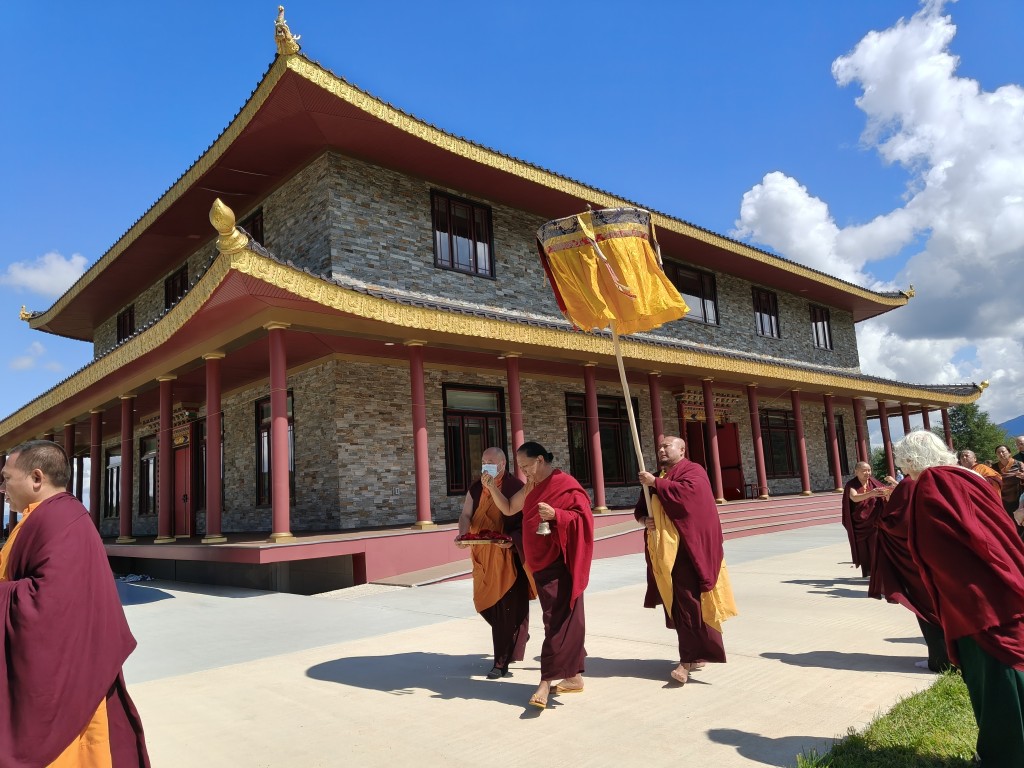 In the summer of 2025 at Mindrolling Lotus Garden, the long-awaited consecration of the newly built temple, Mindrol Gatsal, took place. Mindrolling Lotus Garden sangha members gathered from around the world to take part in this wonderful occasion.  The process began with the elaborate po chog, the ritual for transferring the sacred contents, blessings, and siddhis from the old shrine room to the new temple.  The po chog was held on the 16th of August, 2025. The ritual centers around the melong, or mirror, that serves as the physical support to gather the jnanasattvas and their blessings that the old shrine room has been imbued with over years of practice, studies, teachings, and transmissions.  The melong is then covered in cloth in the colors of the Five Buddha Families and brought in a ceremonial procession from the old temple into the new temple.