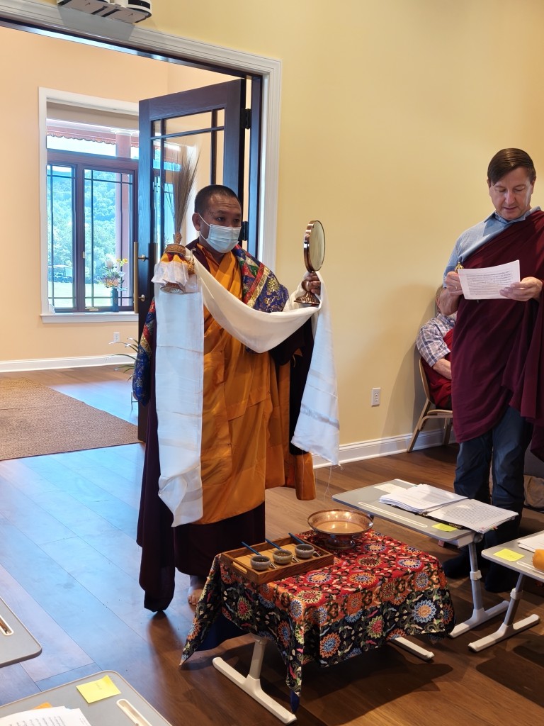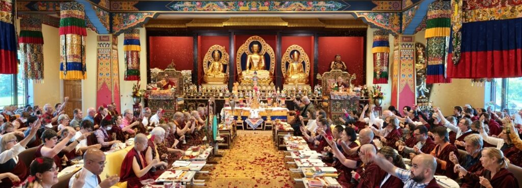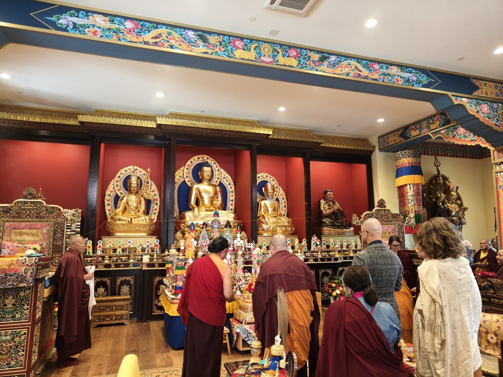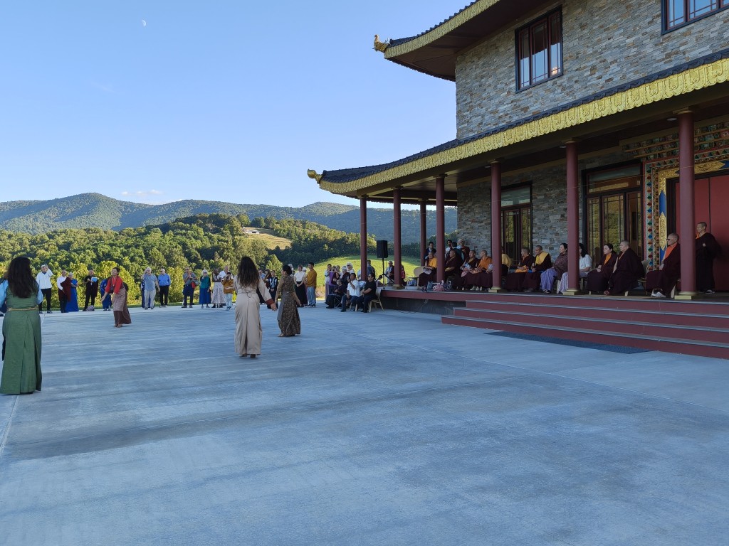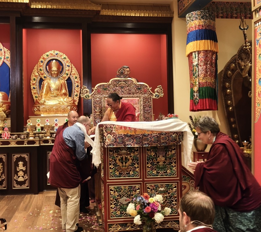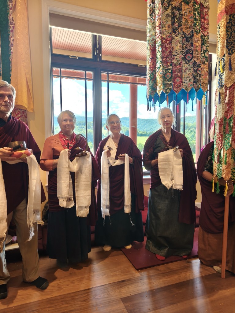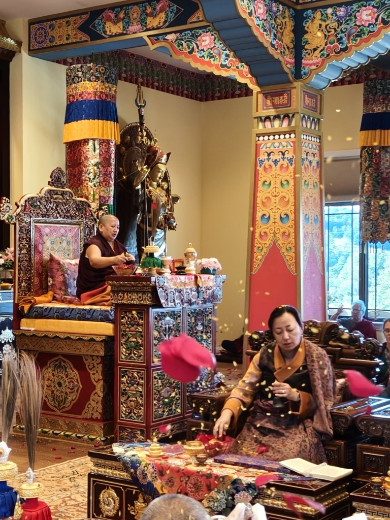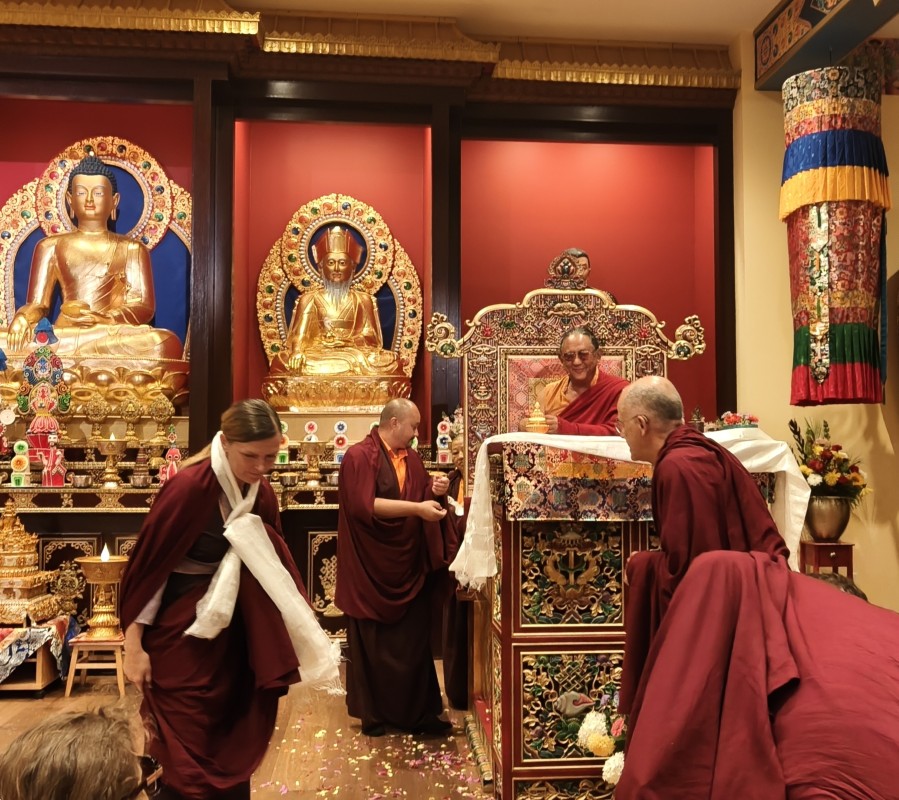 In the summer of 2025 at Mindrolling Lotus Garden, the long-awaited consecration of the newly built temple, Mindrol Gatsal, took place. Mindrolling Lotus Garden sangha members gathered from around the world to take part in this wonderful occasion.  The process began with the elaborate po chog, the ritual for transferring the sacred contents, blessings, and siddhis from the old shrine room to the new temple.  The po chog was held on the 16th of August, 2025. The ritual centers around the melong, or mirror, that serves as the physical support to gather the jnanasattvas and their blessings that the old shrine room has been imbued with over years of practice, studies, teachings, and transmissions.  The melong is then covered in cloth in the colors of the Five Buddha Families and brought in a ceremonial procession from the old temple into the new temple.