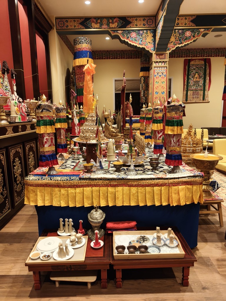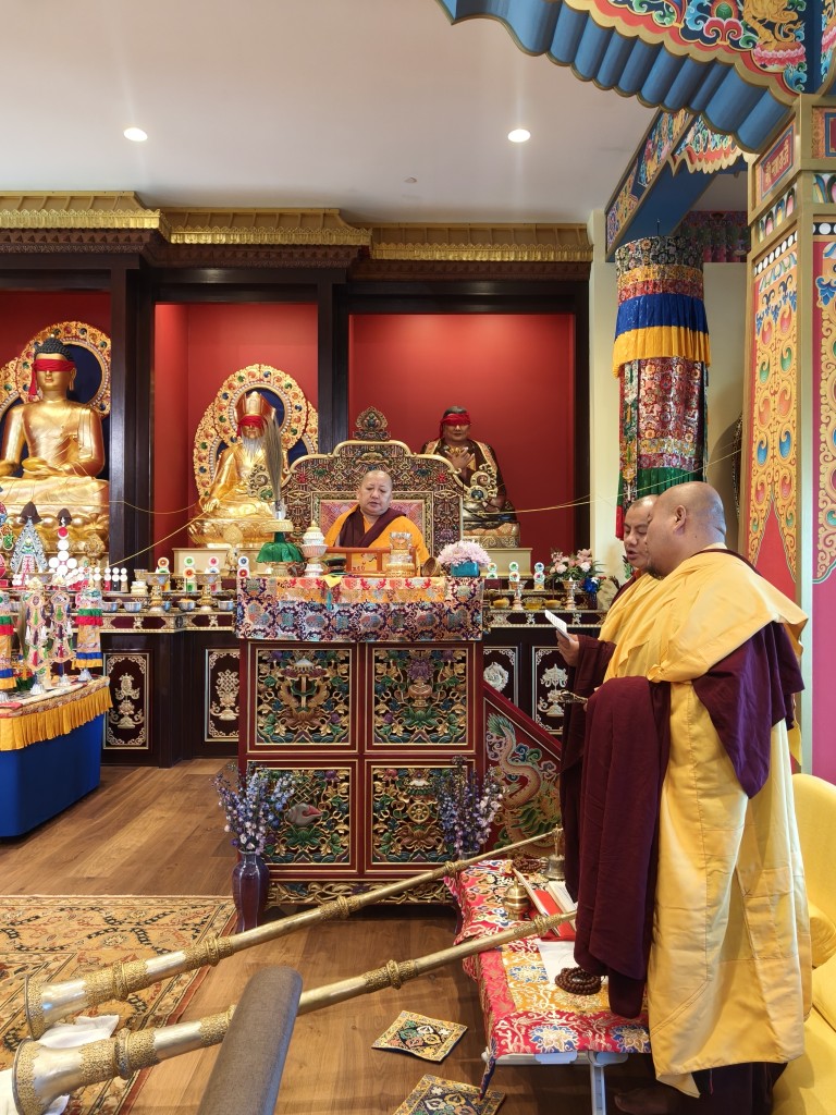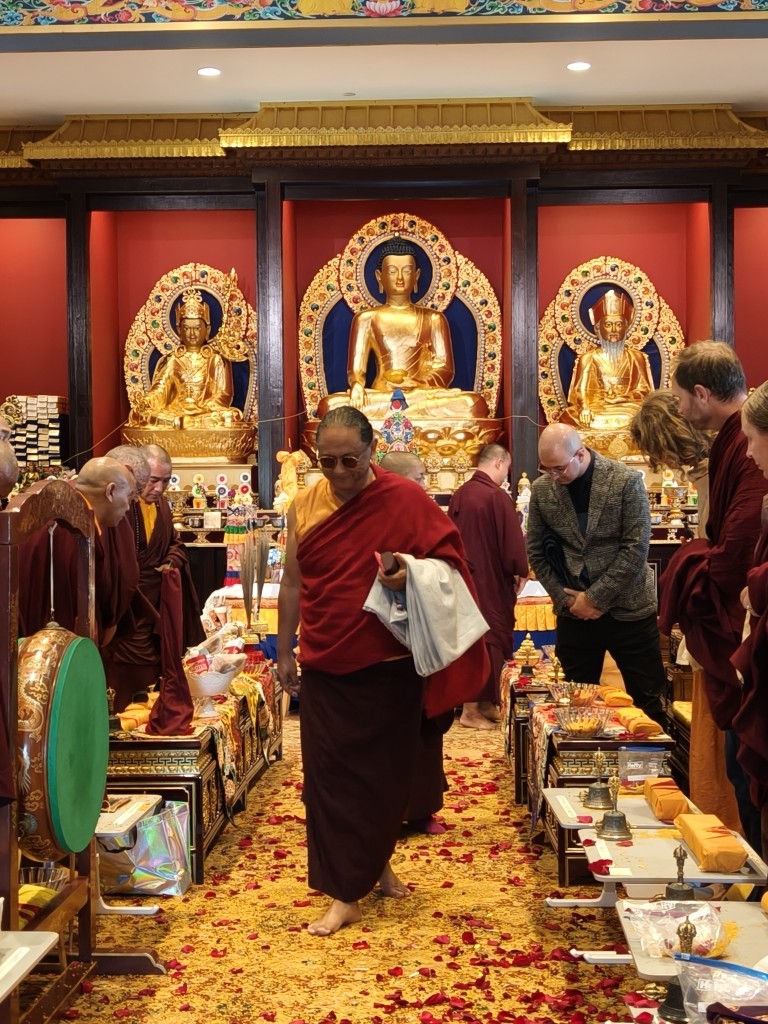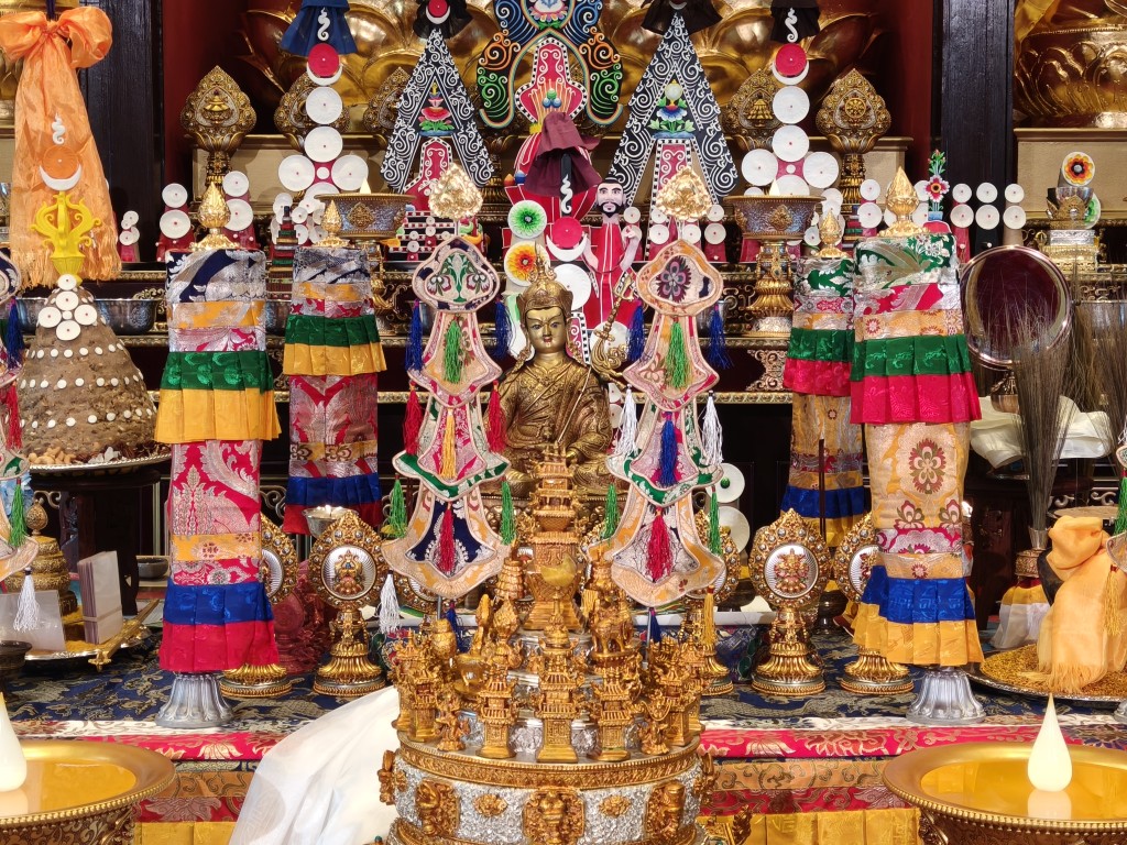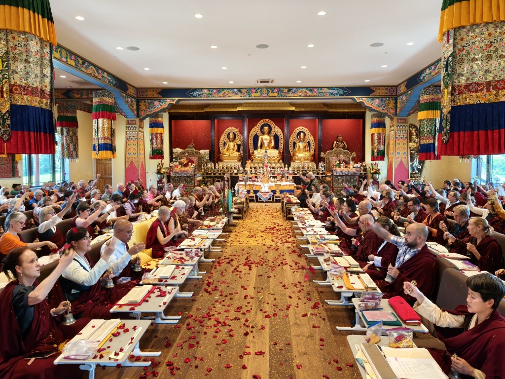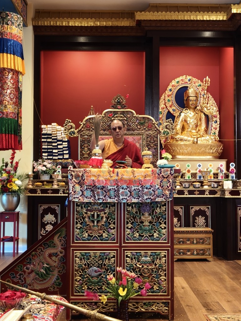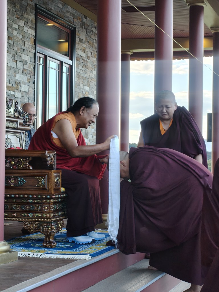 In the summer of 2025 at Mindrolling Lotus Garden, the long-awaited consecration of the newly built temple, Mindrol Gatsal, took place. Mindrolling Lotus Garden sangha members gathered from around the world to take part in this wonderful occasion.  The process began with the elaborate po chog, the ritual for transferring the sacred contents, blessings, and siddhis from the old shrine room to the new temple.  The po chog was held on the 16th of August, 2025. The ritual centers around the melong, or mirror, that serves as the physical support to gather the jnanasattvas and their blessings that the old shrine room has been imbued with over years of practice, studies, teachings, and transmissions.  The melong is then covered in cloth in the colors of the Five Buddha Families and brought in a ceremonial procession from the old temple into the new temple.