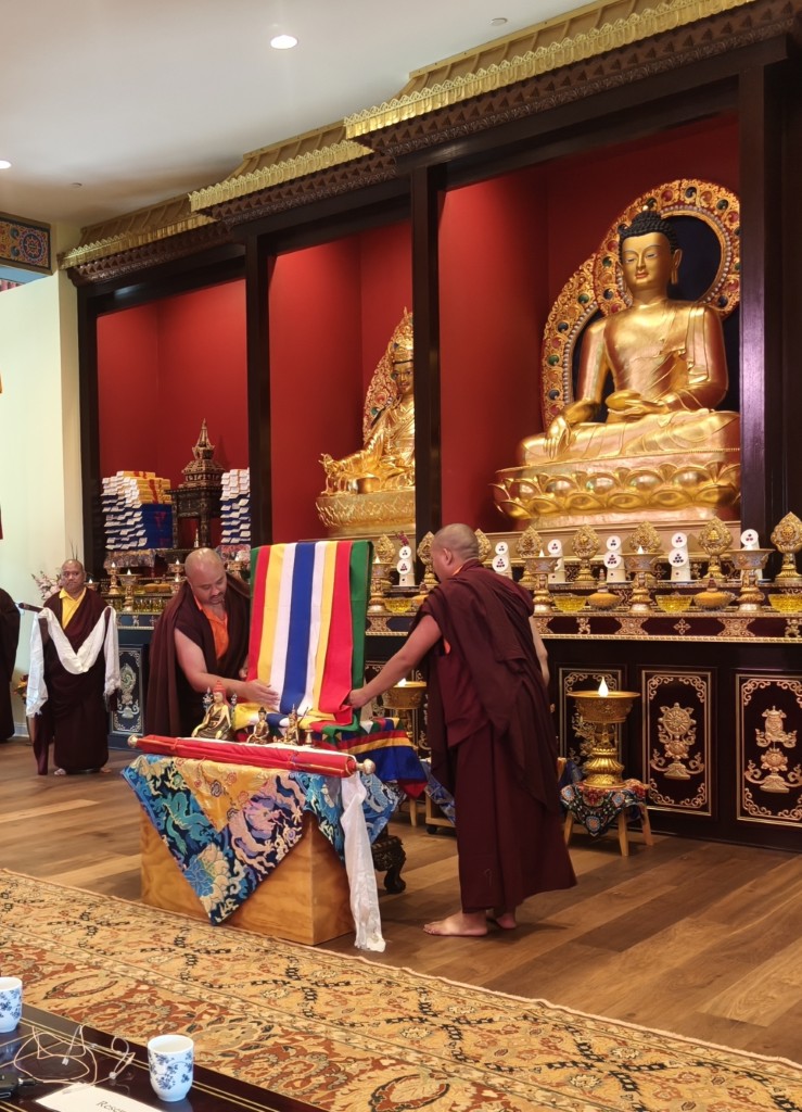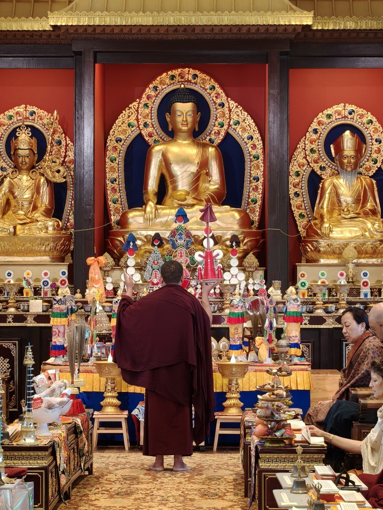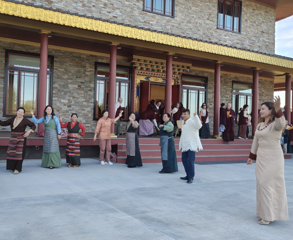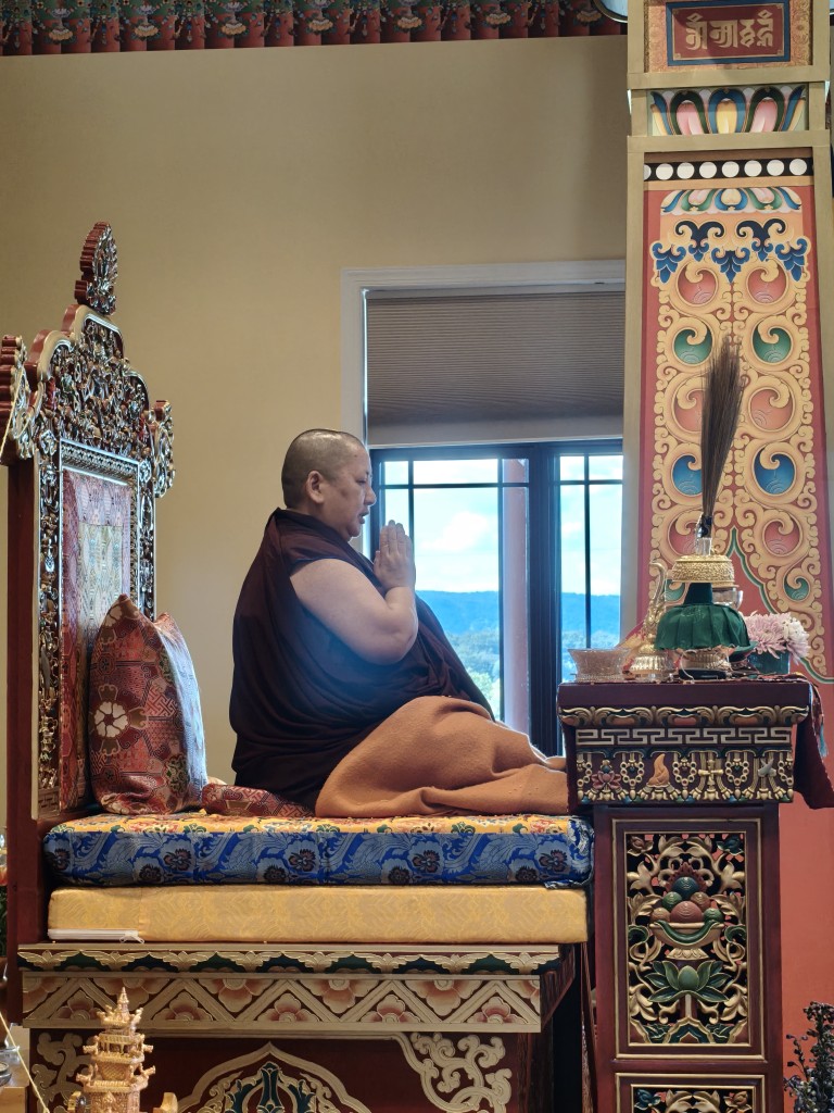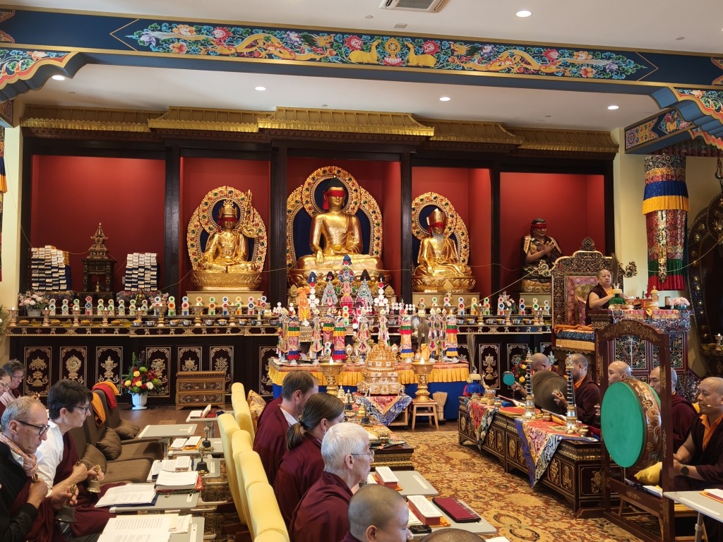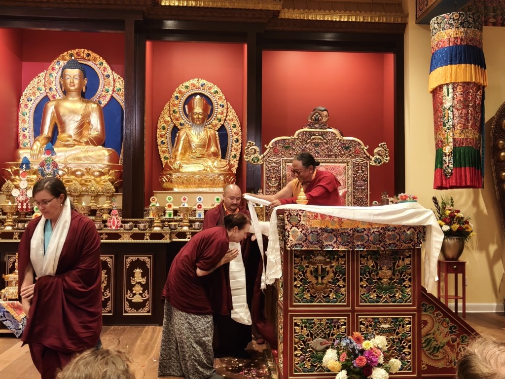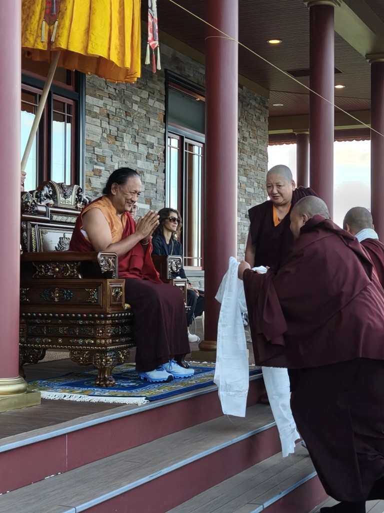 In the summer of 2025 at Mindrolling Lotus Garden, the long-awaited consecration of the newly built temple, Mindrol Gatsal, took place. Mindrolling Lotus Garden sangha members gathered from around the world to take part in this wonderful occasion.  The process began with the elaborate po chog, the ritual for transferring the sacred contents, blessings, and siddhis from the old shrine room to the new temple.  The po chog was held on the 16th of August, 2025. The ritual centers around the melong, or mirror, that serves as the physical support to gather the jnanasattvas and their blessings that the old shrine room has been imbued with over years of practice, studies, teachings, and transmissions.  The melong is then covered in cloth in the colors of the Five Buddha Families and brought in a ceremonial procession from the old temple into the new temple.