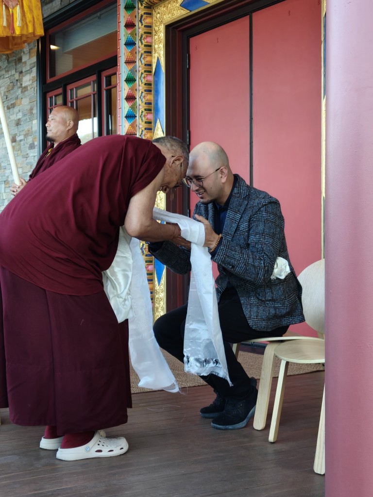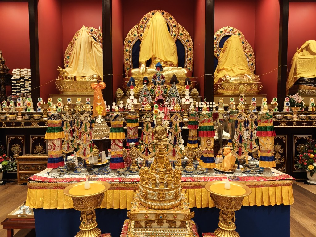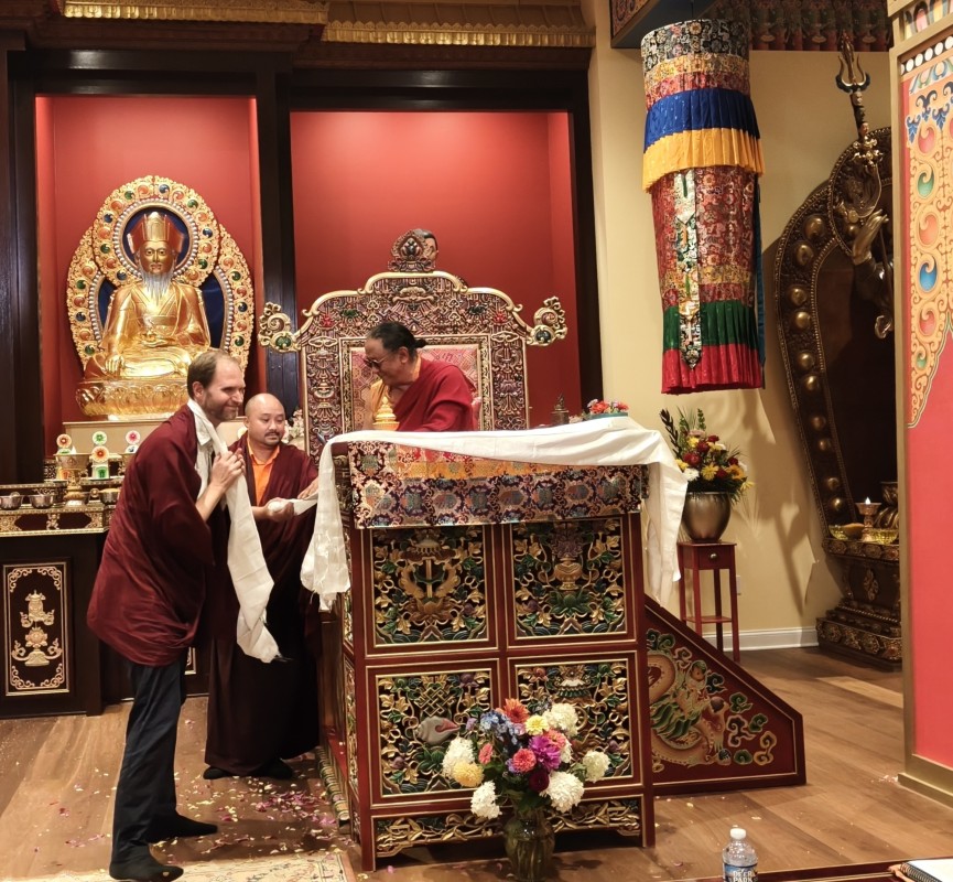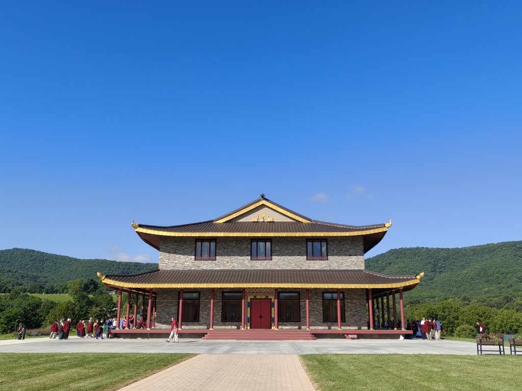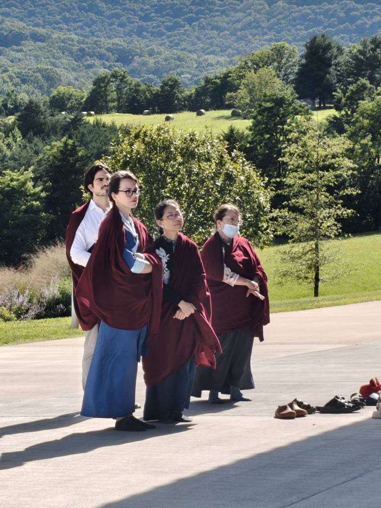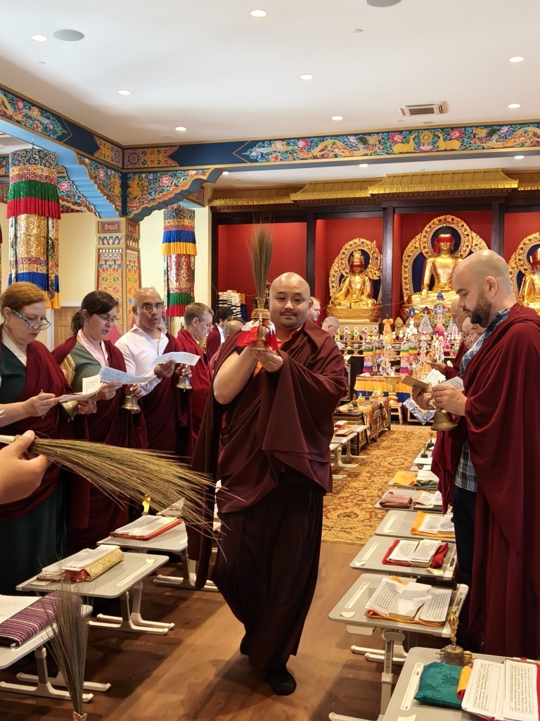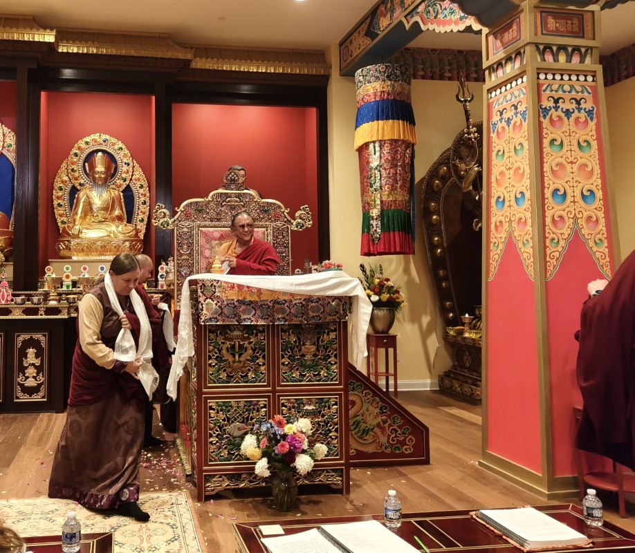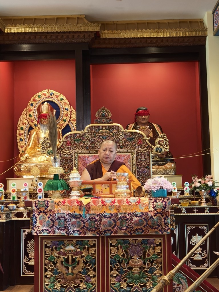 In the summer of 2025 at Mindrolling Lotus Garden, the long-awaited consecration of the newly built temple, Mindrol Gatsal, took place. Mindrolling Lotus Garden sangha members gathered from around the world to take part in this wonderful occasion.  The process began with the elaborate po chog, the ritual for transferring the sacred contents, blessings, and siddhis from the old shrine room to the new temple.  The po chog was held on the 16th of August, 2025. The ritual centers around the melong, or mirror, that serves as the physical support to gather the jnanasattvas and their blessings that the old shrine room has been imbued with over years of practice, studies, teachings, and transmissions.  The melong is then covered in cloth in the colors of the Five Buddha Families and brought in a ceremonial procession from the old temple into the new temple.