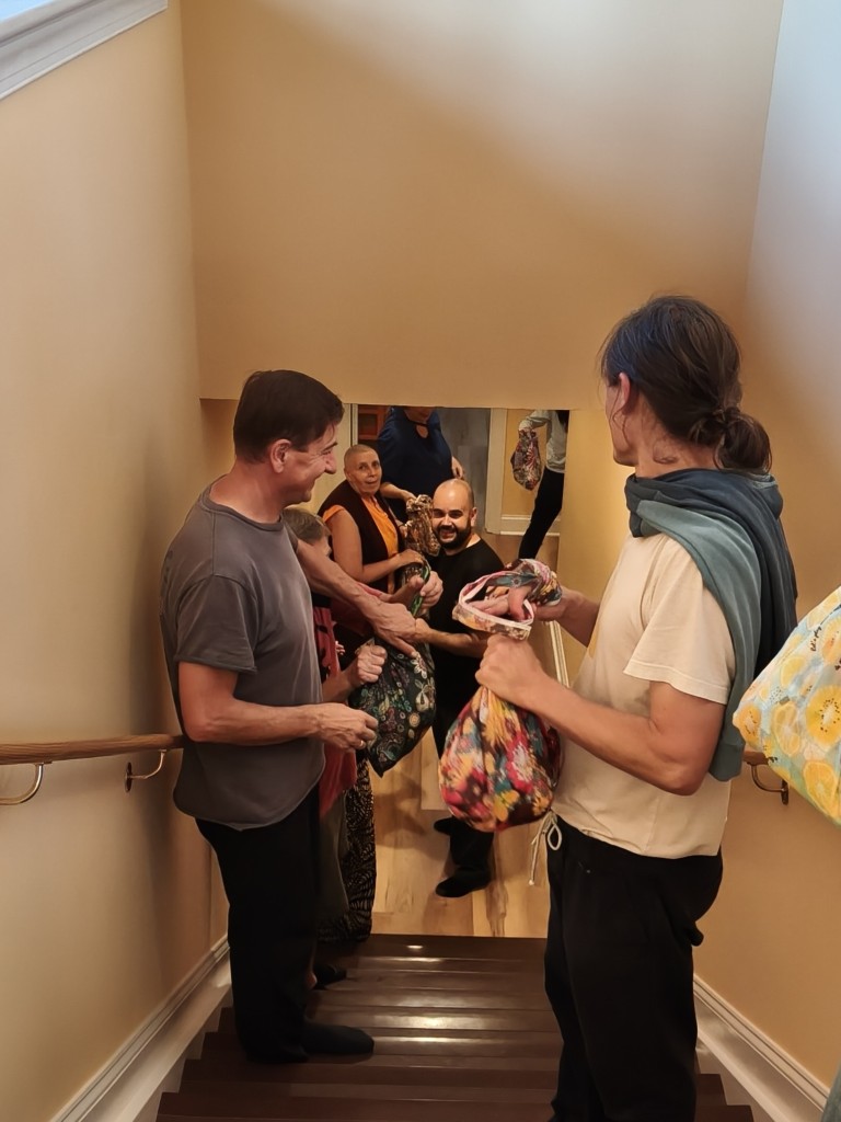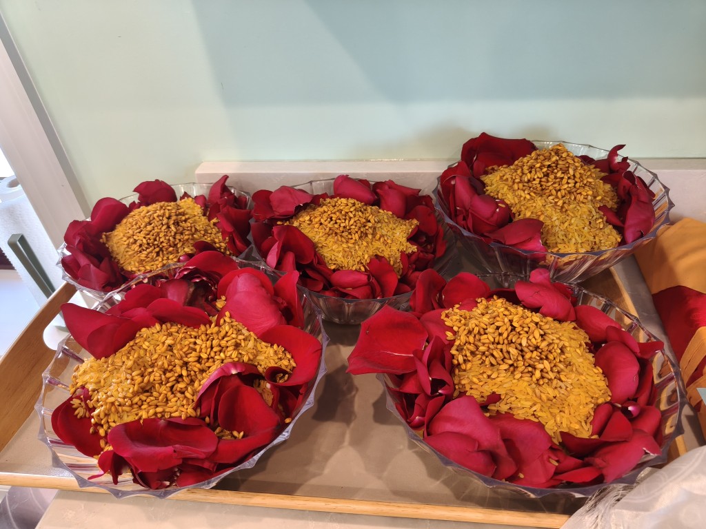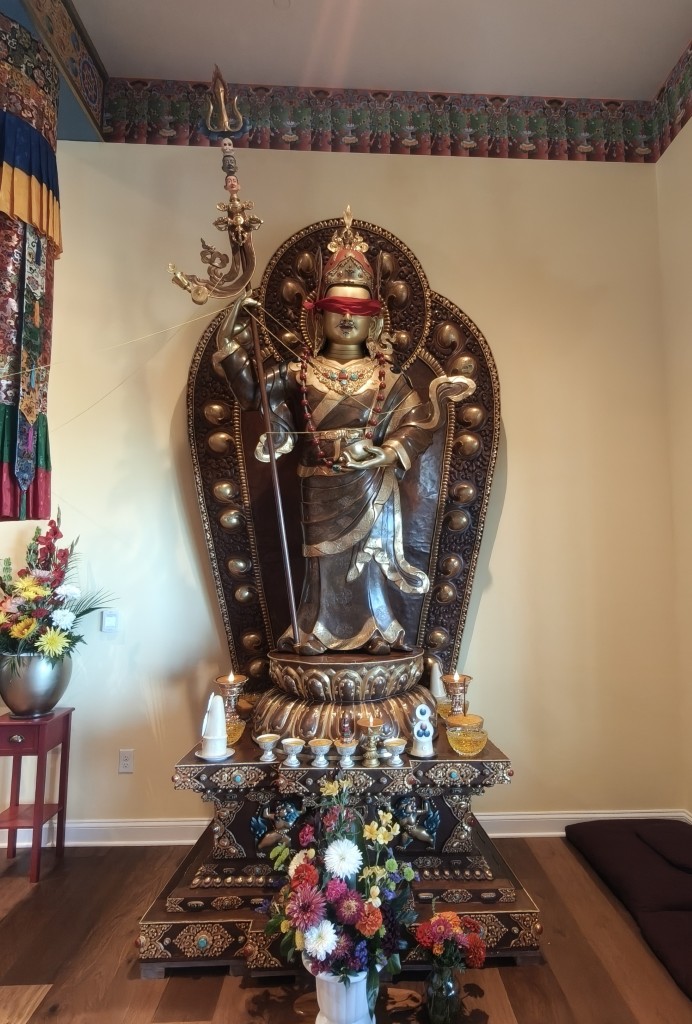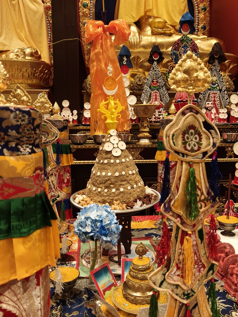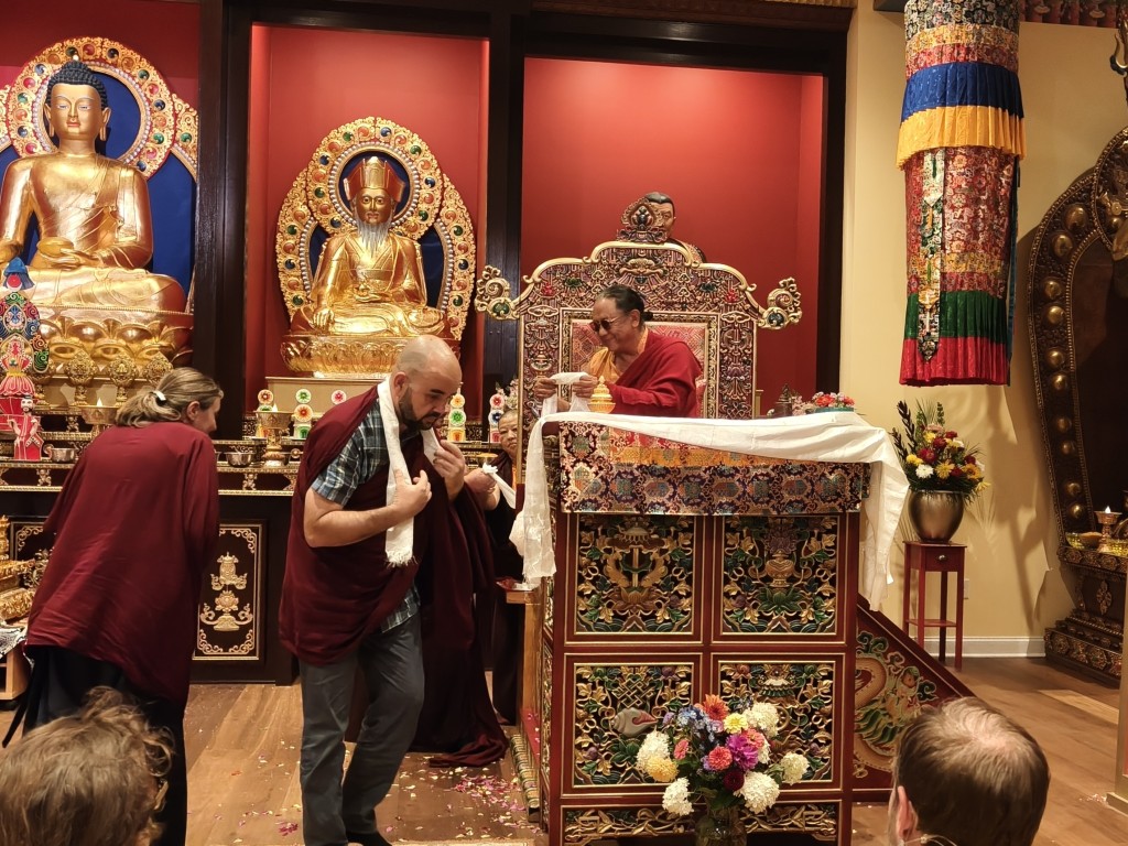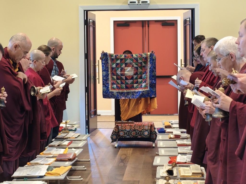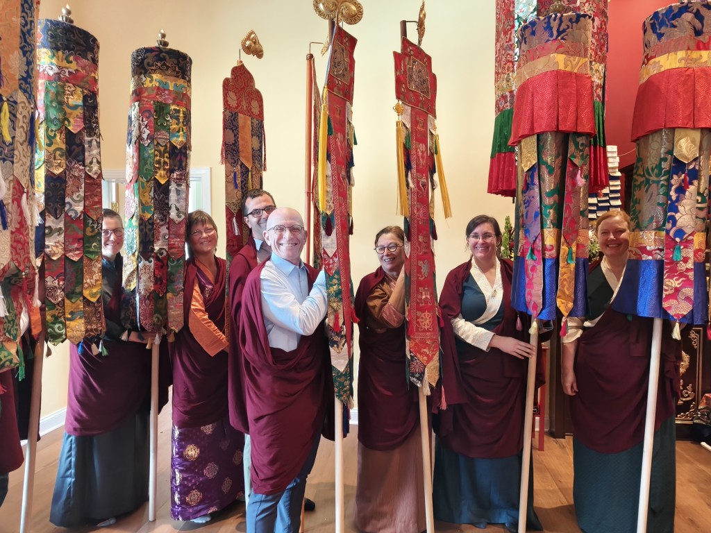 In the summer of 2025 at Mindrolling Lotus Garden, the long-awaited consecration of the newly built temple, Mindrol Gatsal, took place. Mindrolling Lotus Garden sangha members gathered from around the world to take part in this wonderful occasion.  The process began with the elaborate po chog, the ritual for transferring the sacred contents, blessings, and siddhis from the old shrine room to the new temple.  The po chog was held on the 16th of August, 2025. The ritual centers around the melong, or mirror, that serves as the physical support to gather the jnanasattvas and their blessings that the old shrine room has been imbued with over years of practice, studies, teachings, and transmissions.  The melong is then covered in cloth in the colors of the Five Buddha Families and brought in a ceremonial procession from the old temple into the new temple.