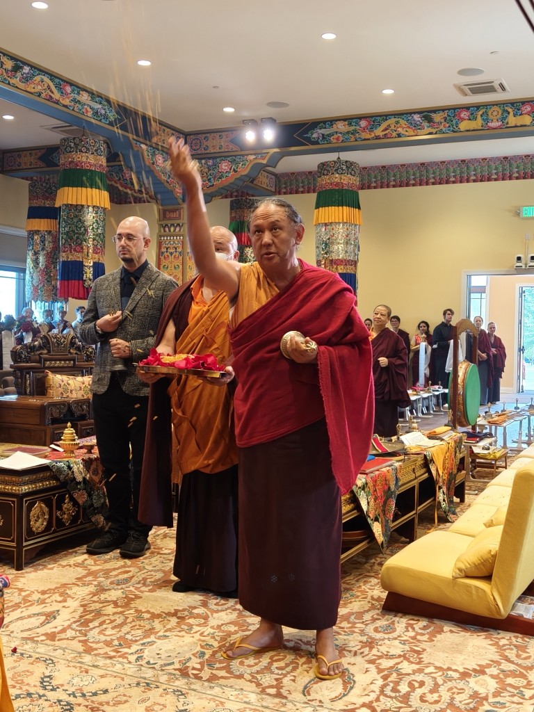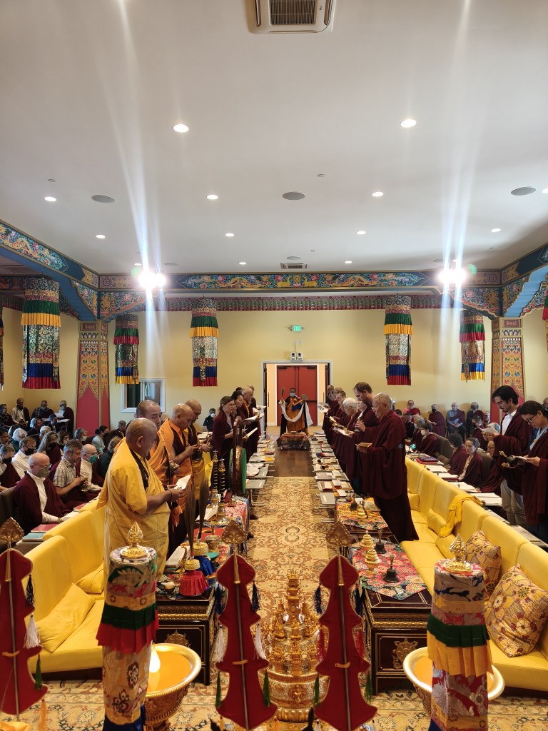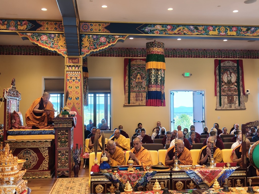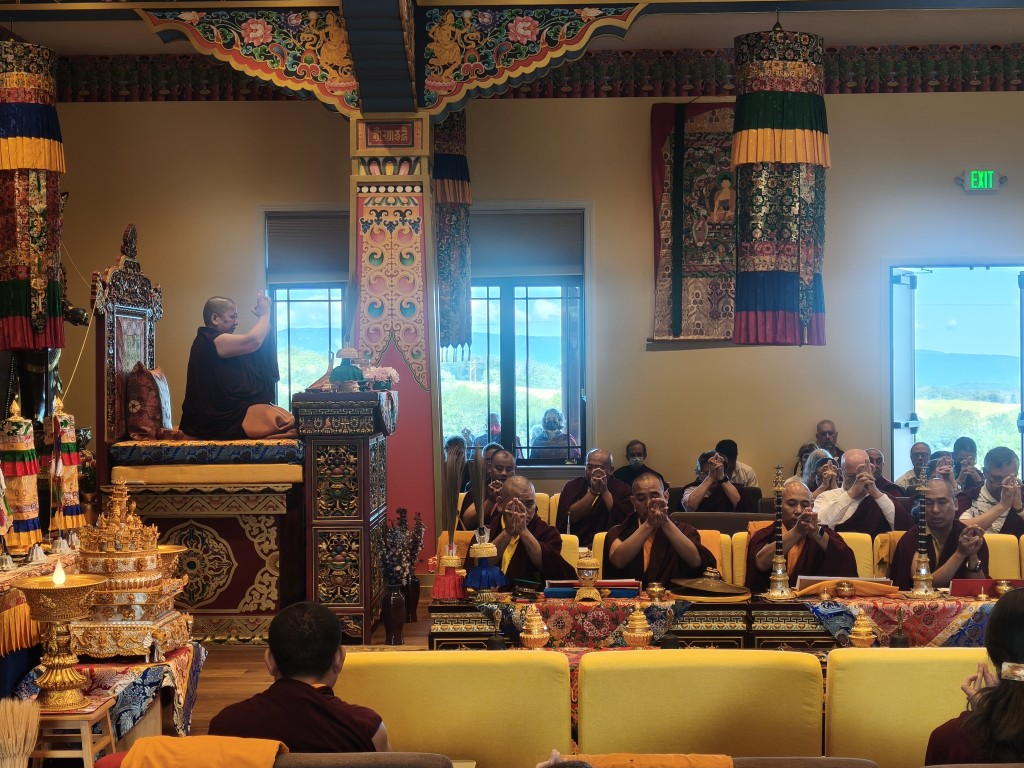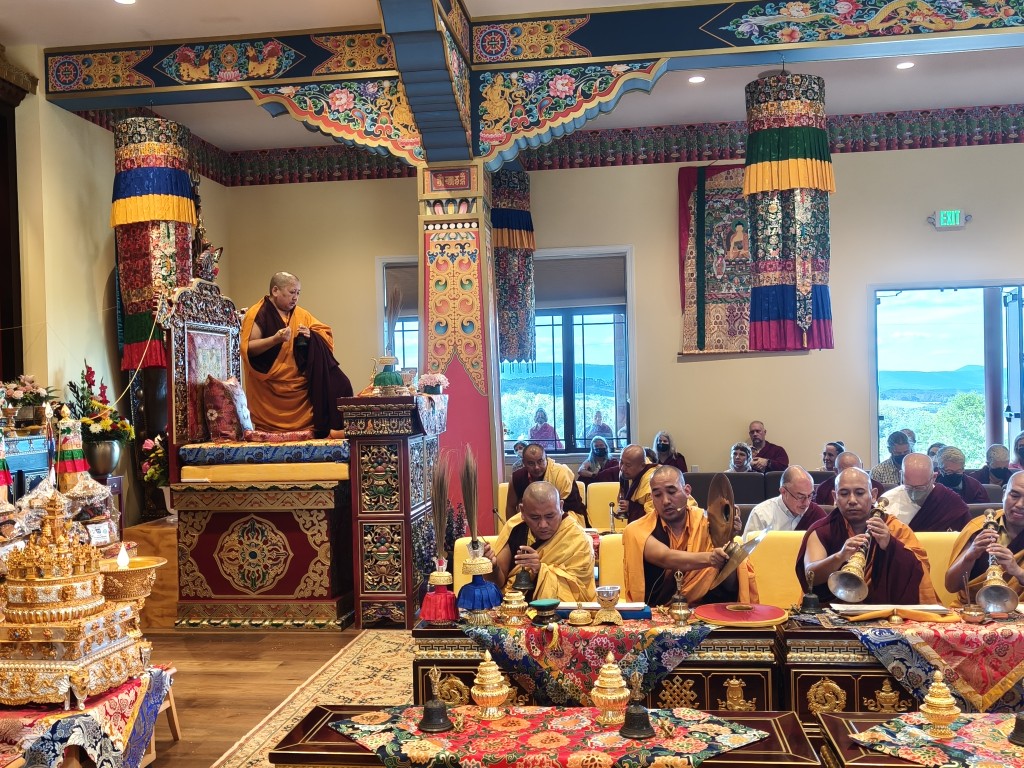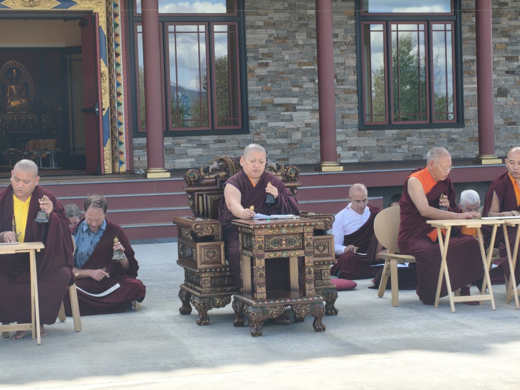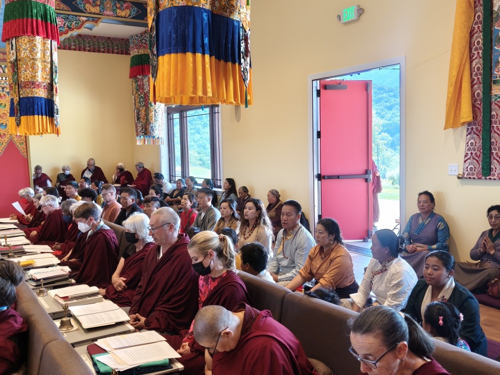 It was a wonderful celebration as the ritual was brought to conclusion. The gathered Rinpoches, monks, nuns, and lay practitioners practiced together in harmony and joined in the sincere aspiration that Mindrol Gatsal will be a place to hold and support the practice and transmission of the authentic Buddhadharma far into the future. The auspicious and joyful sedreng and blessing rituals were performed, and the entire environment blossomed fully with blessings and auspiciousness. This event marks an extraordinary landmark in the history of Mindrolling and the establishment of Mindrolling in the West. The vision of Mindrolling as the source of pure Dharma, a vessel for authentic and unadulterated transmissions, a place for deepened studies and practice, and wholehearted training manifested on the land of Pema Gatsal.