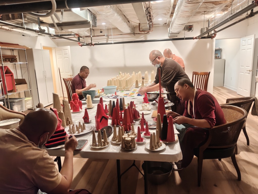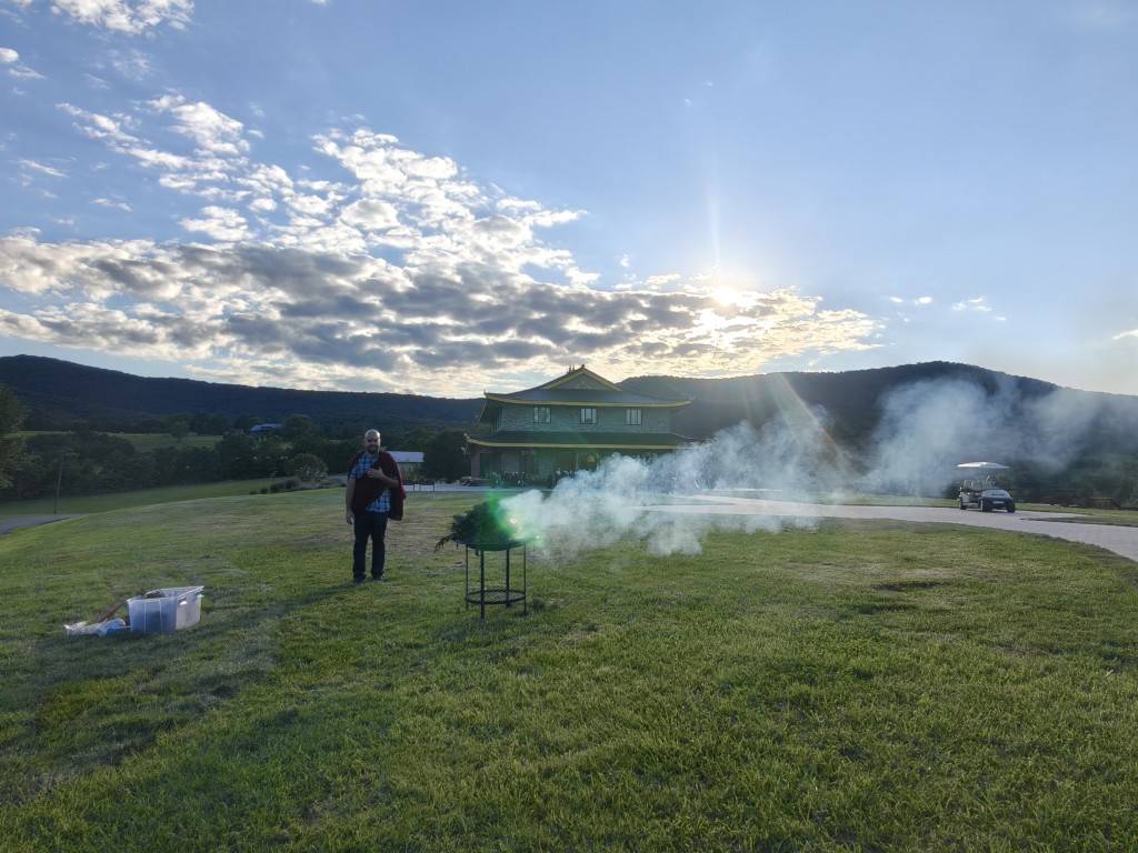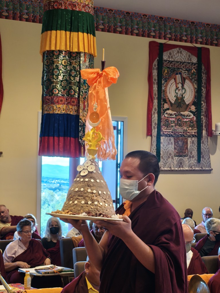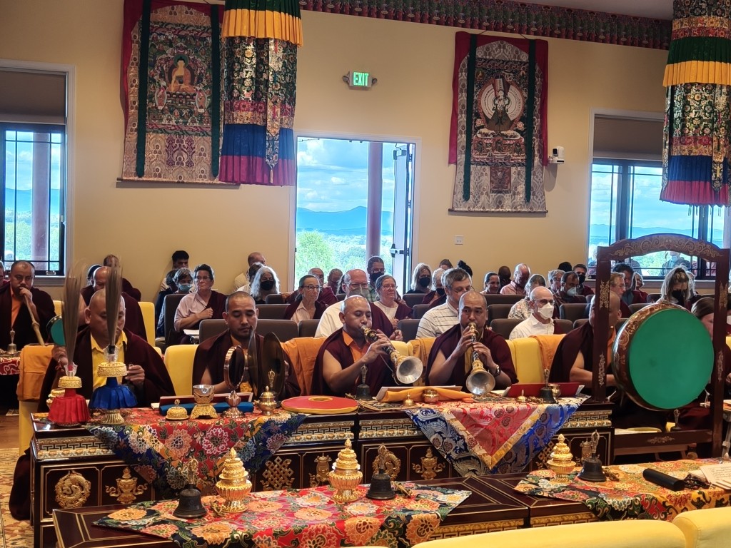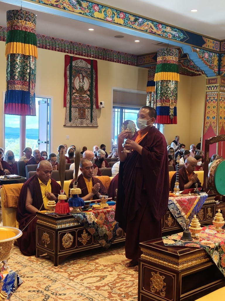 This most extensive rabne ritual, accomplished according to the tradition of Terdag Lingpa, comprised three days of intensive practice, beginning on the auspicious 8th lunar day of the 7th lunar month. Hundreds of sangha members joined in the ceremonies including over a hundred members of the local Virginia Tibetan community. The final day of the rabne fell on the auspicious Guru Rinpoche Day (the 10th lunar day), and to the great good fortune of the gathered assembly, His Eminence Dzigar Kongtrul Rinpoche presided over the rabne ritual on this auspicious.