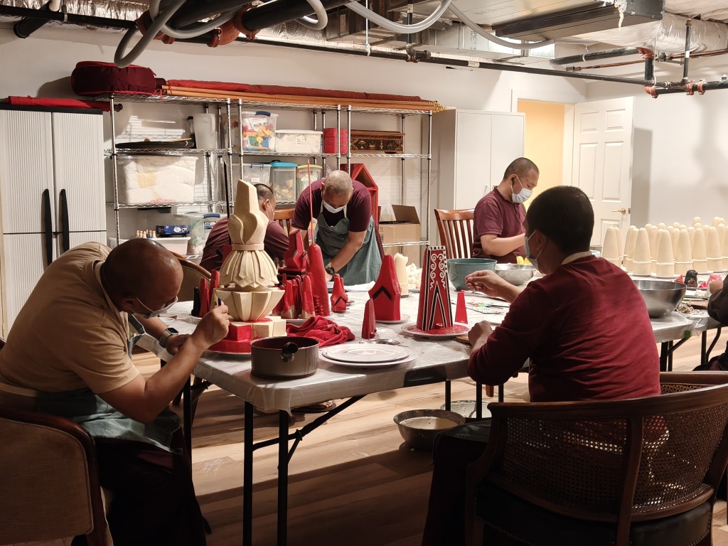 Parallel to the Practice Intensive Retreat, the many khenpos and senior monks of Mindrolling together with chöpons of Pema Gatsal began the preparation for the rabne ritual, the actual consecration of the temple. The new shrine rooms were filled with abundant offerings and tormas, and the elaborate mandala was created as the support for the practice. One continuous zung thag (mantra thread) was tied around every shrine and sacred representation in Mindrol Gatsal and then around the entire temple itself.