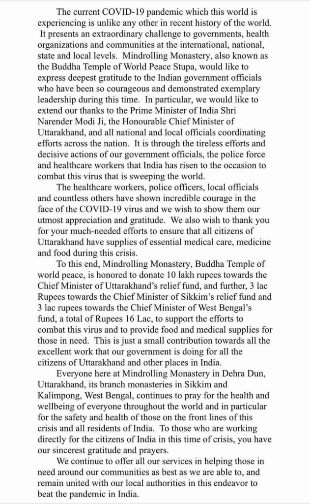 Mindrolling Monastery wishes to extend most sincere gratitude and thanks to all of these courageous individuals. As a small token of this gratitude and in order to support the relief efforts, Mindrolling has offered 1.6 million rupees to the relief funds established by the Honorable Chief Ministers of Uttarakhand, Sikkim and West Bengal to provide equipment and support to fight the pandemic during this time. In addition, Mindrolling Monastery is supporting the efforts to fight the pandemic by providing food and supplies to the local community and the daily wage workers during these difficult times. Everyone here at Mindrolling Monastery in Dehra Dun, Uttarakhand, and its branch monasteries in Sikkim and Kalimpong, West Bengal continues to pray for the health and well being of everyone throughout the world and in particular for all those who continue to work courageously to fight the pandemic.