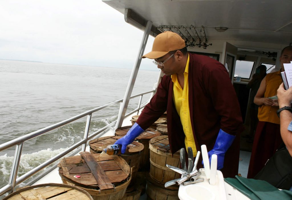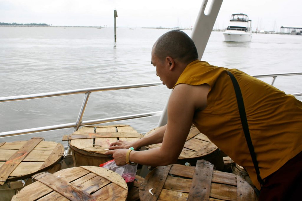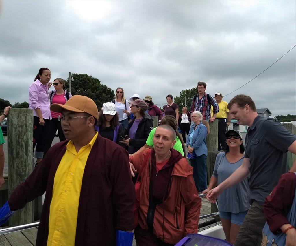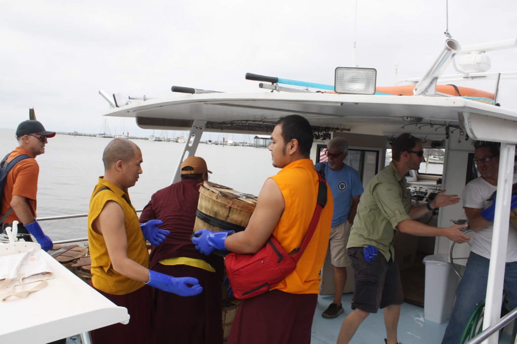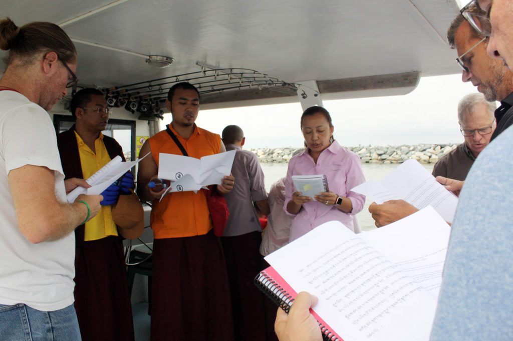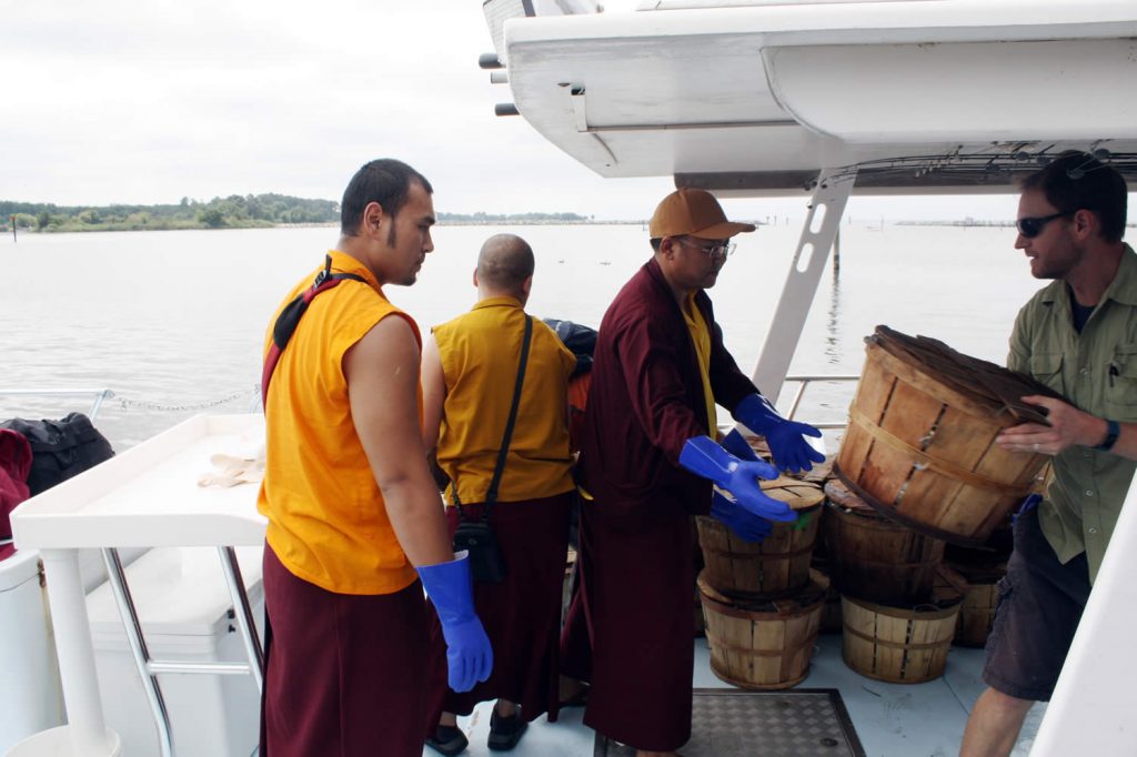 Many thousands of crabs were released by Her Eminence Jetsün Dechen Paldrön, Dungse Rinpoche, Jetsün Rinpoche, Ven. Choktrul Ngawang Jigdral Rinpoche, Ven. Khenpo Namdrol Gyatso, Ven. Lopön Thrinley Gyaltsen and Kunda Britton Bosarge la who were joined by staff and sangha members. Prayers for Life Release and the Long-Life Supplication to Jetsün Khandro Rinpoche were recited on board the boat, led by Ven. Choktrul Ngawang Jigdral Rinpoche, chief Umdze of Mindrolling Monastery. Each bushel of crabs was blessed and marked with symbols to protect them from being recaptured. The tsethar ceremony concluded in a nearby park where everyone gathered to recite aspirations.