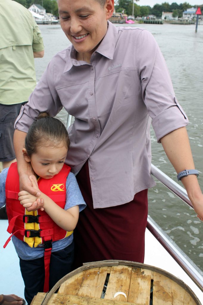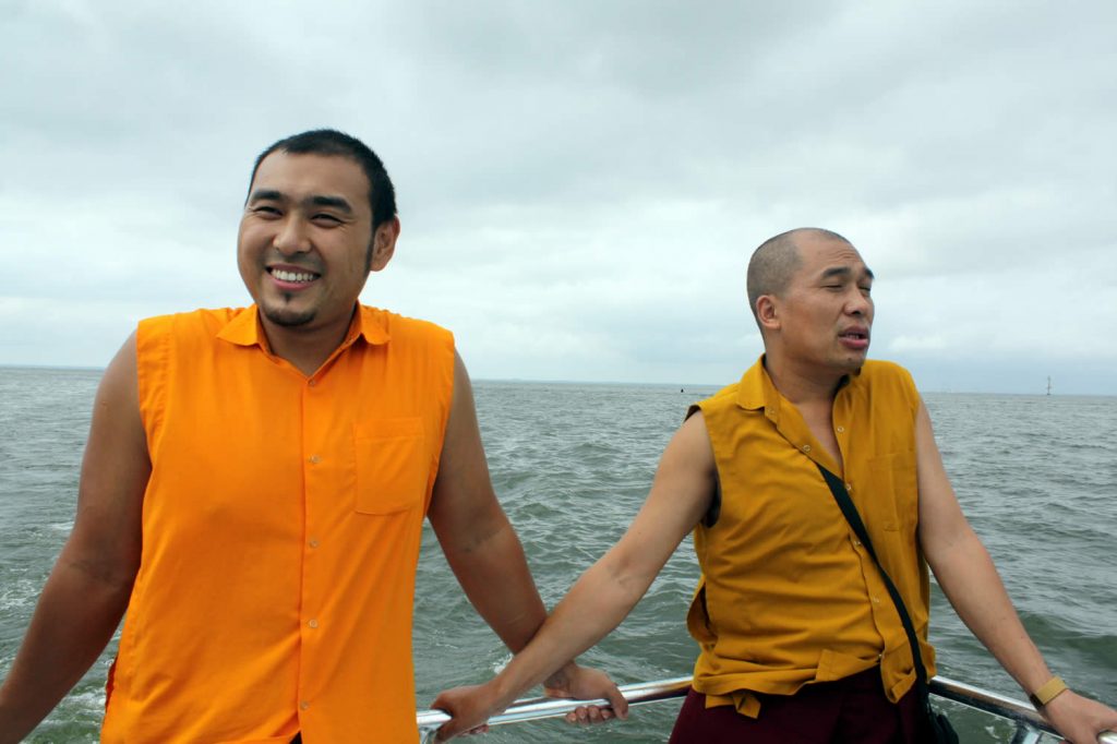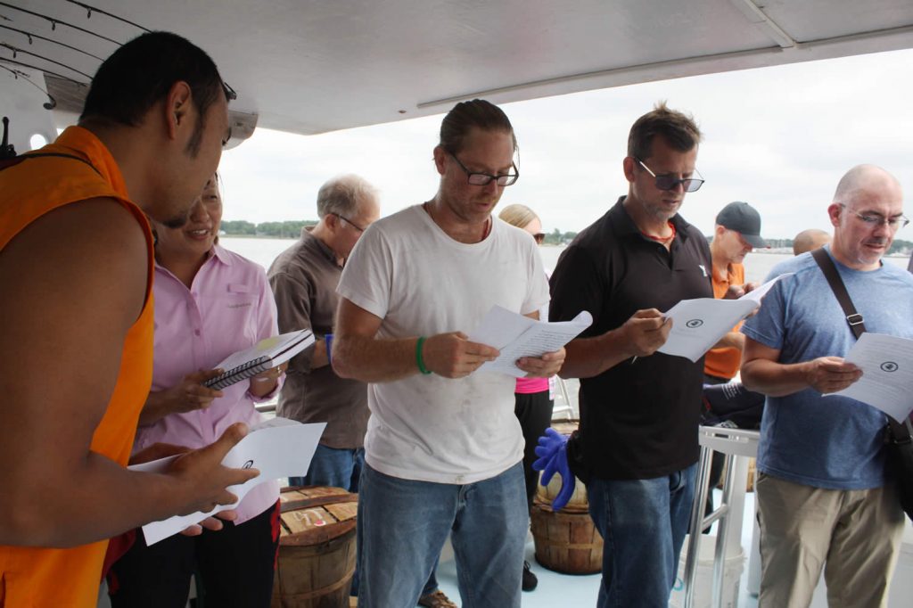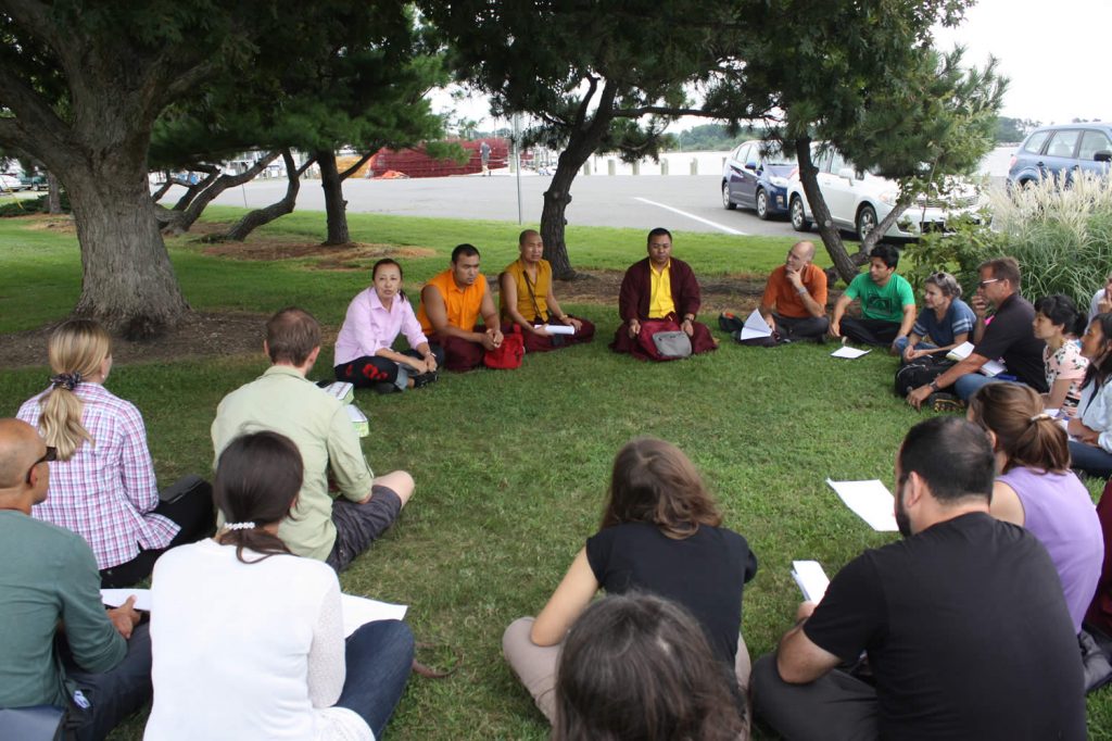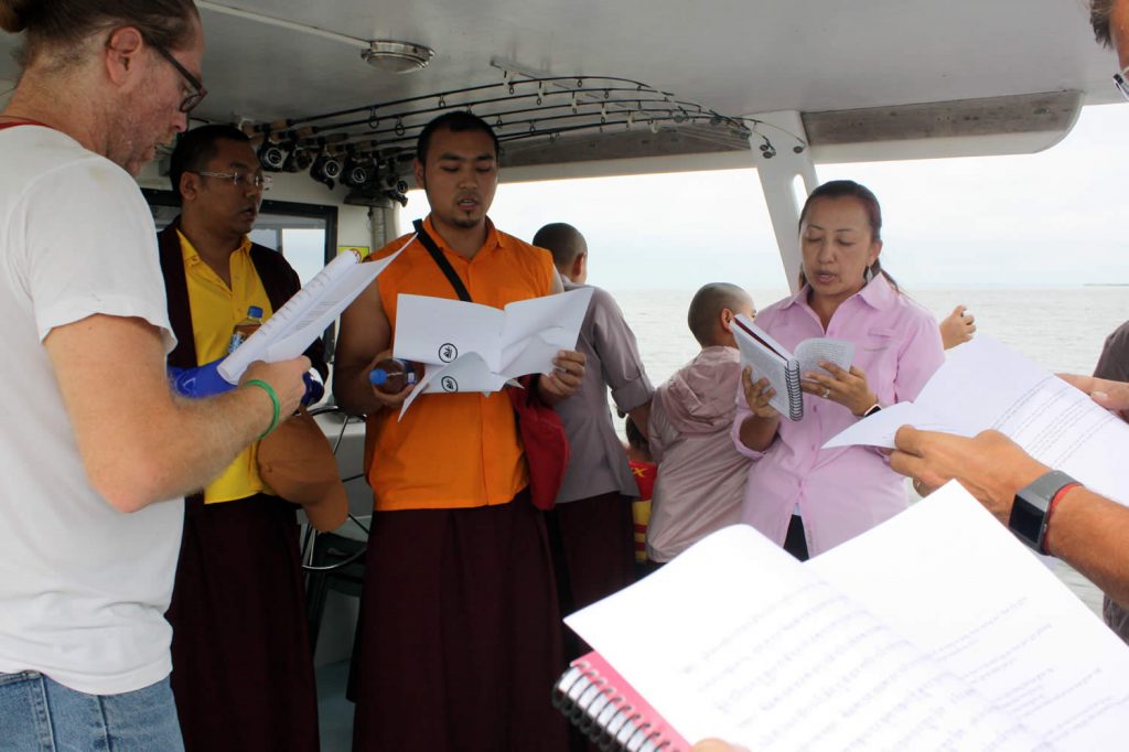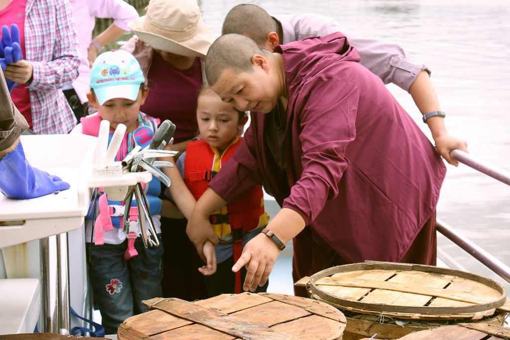 Many thousands of crabs were released by Her Eminence Jetsün Dechen Paldrön, Dungse Rinpoche, Jetsün Rinpoche, Ven. Choktrul Ngawang Jigdral Rinpoche, Ven. Khenpo Namdrol Gyatso, Ven. Lopön Thrinley Gyaltsen and Kunda Britton Bosarge la who were joined by staff and sangha members. Prayers for Life Release and the Long-Life Supplication to Jetsün Khandro Rinpoche were recited on board the boat, led by Ven. Choktrul Ngawang Jigdral Rinpoche, chief Umdze of Mindrolling Monastery. Each bushel of crabs was blessed and marked with symbols to protect them from being recaptured. The tsethar ceremony concluded in a nearby park where everyone gathered to recite aspirations.