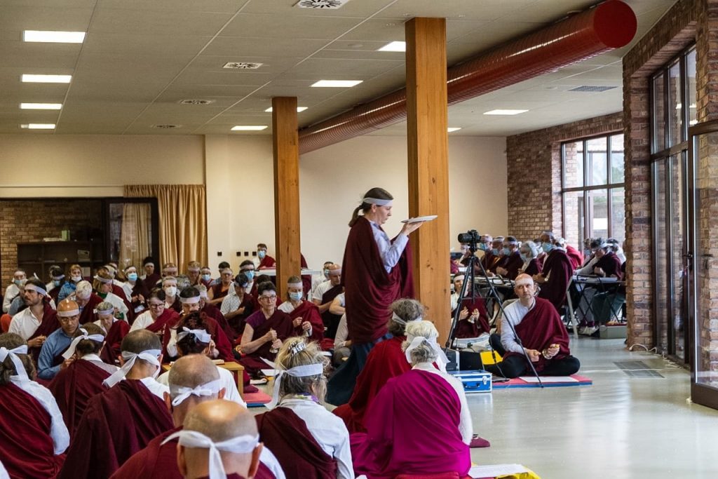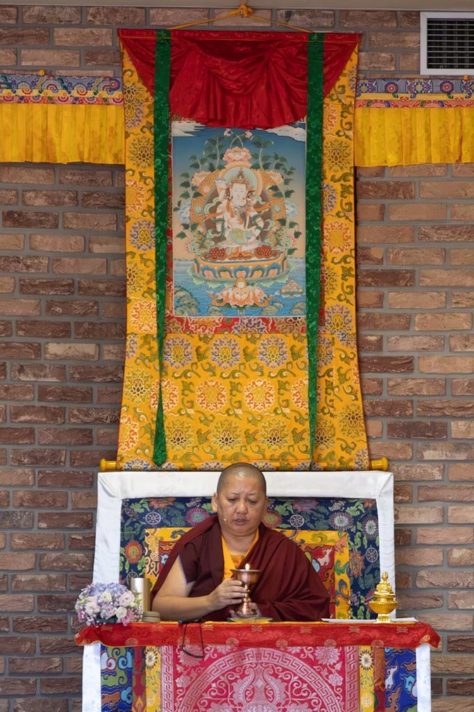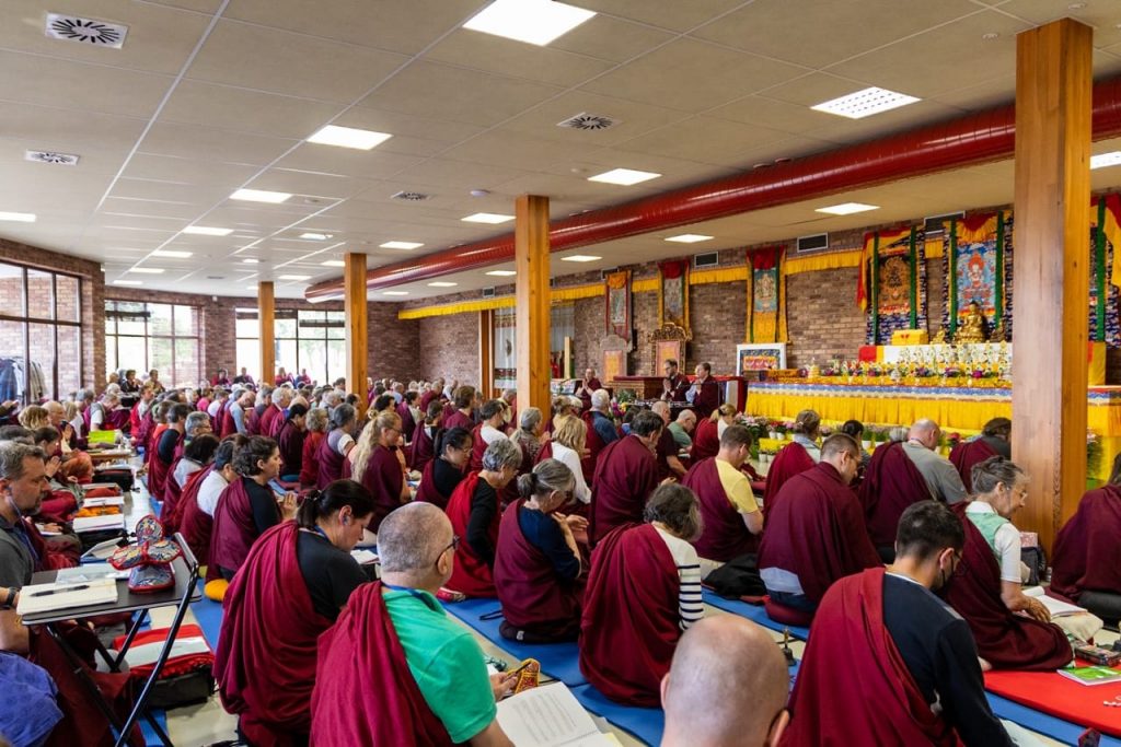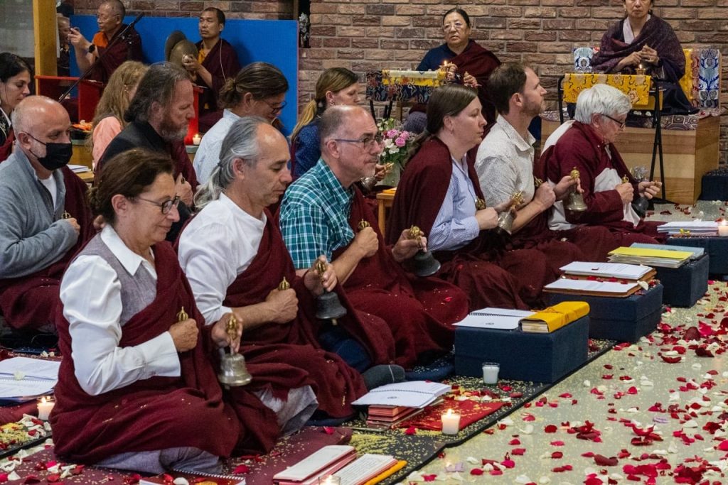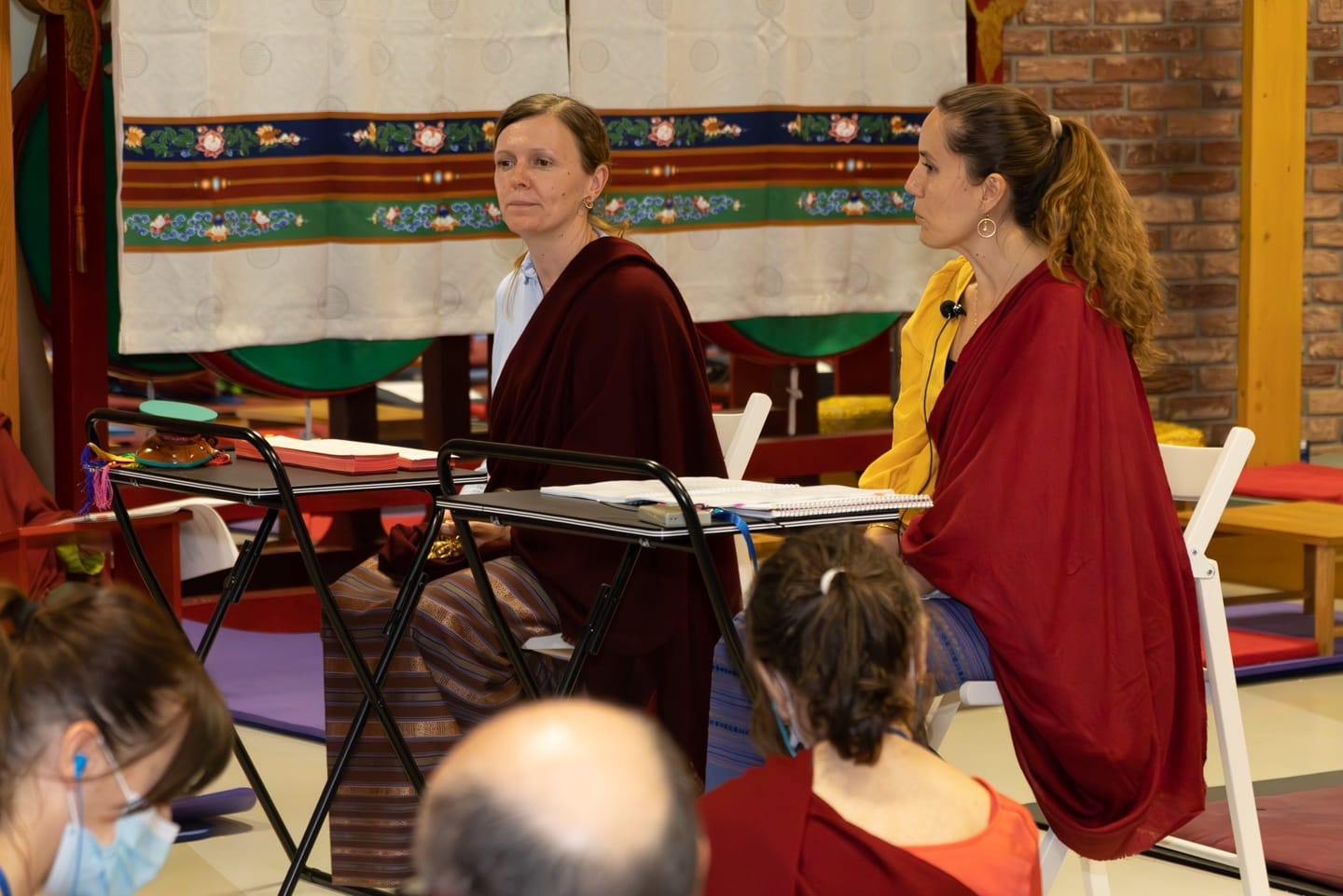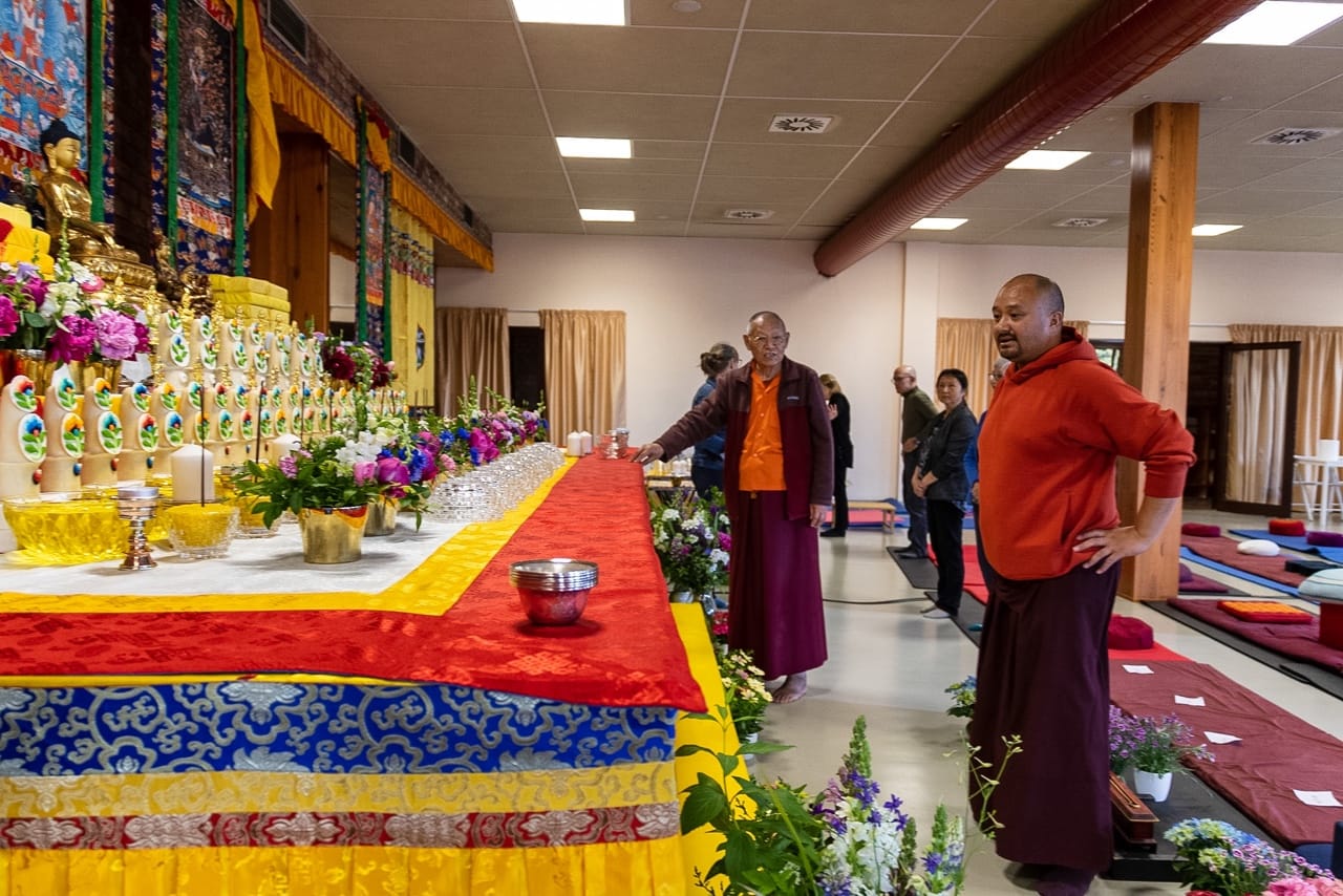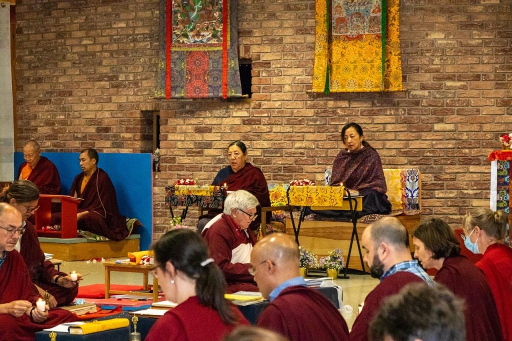 With great kindness, Minling Jetsün Khandro Rinpoche bestowed teachings, oral transmissions, and the Vajrasattva Empowerment to nearly three hundred sangha members from around the world. Monks and nuns from Mindrolling Monastery and Samten Tse Retreat Center made all the preparations for the mandala and the shrine and led the rituals. All sessions and teachings were translated into several languages, including Czech, Spanish, French, German, Polish, and Greek so that all present were able to receive the teachings fully and directly. Furthermore, dharma instructors led review sessions to ensure that all students understood and knew how to do the practices correctly.