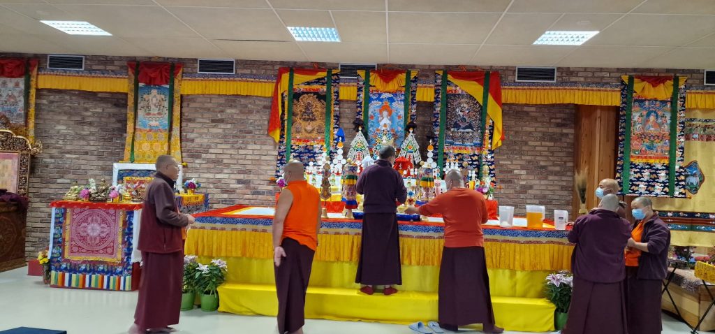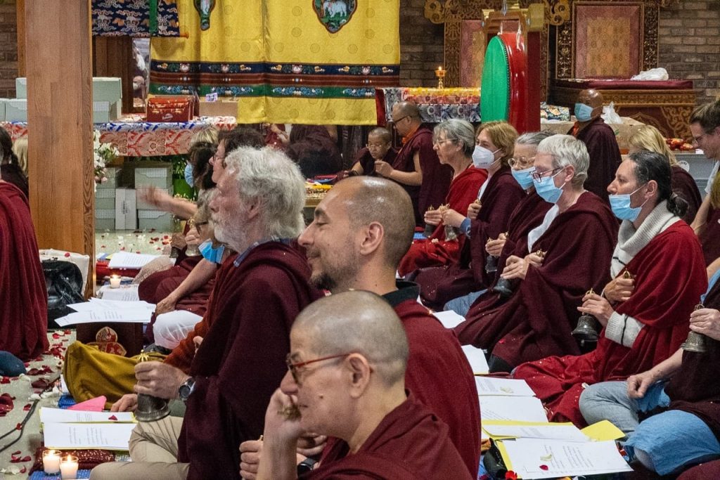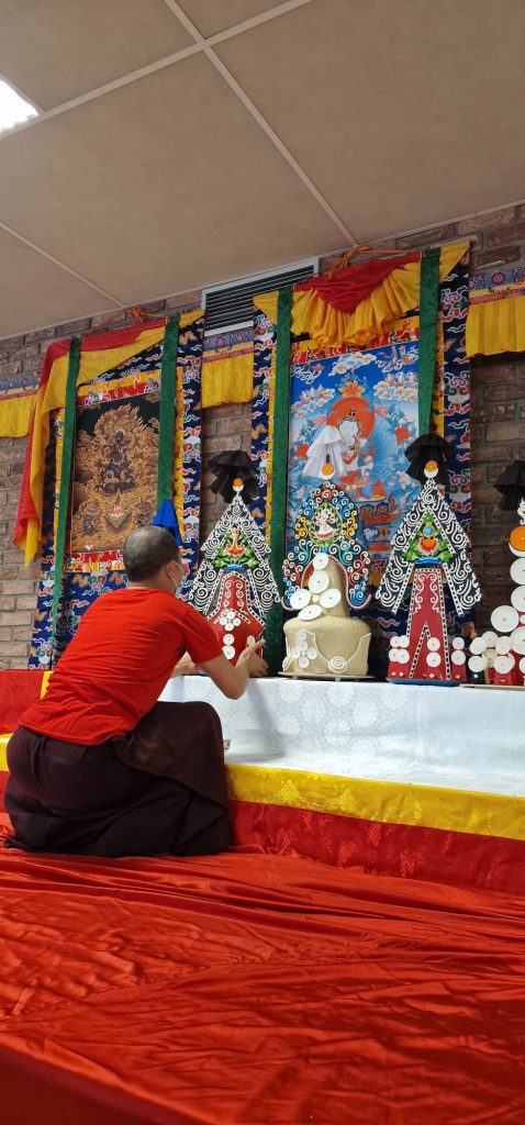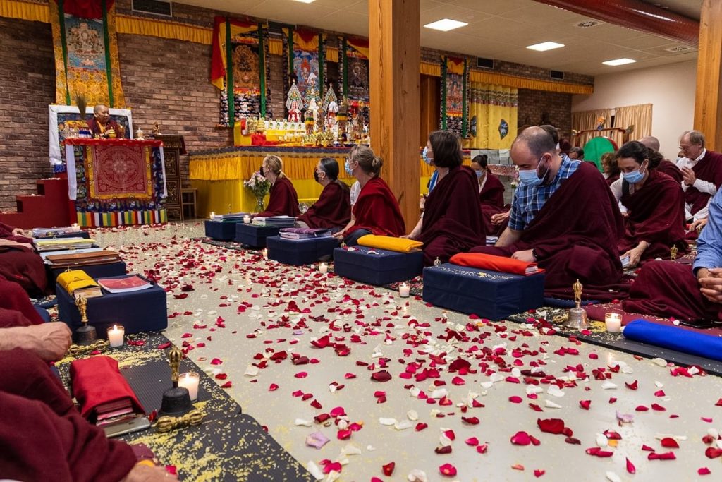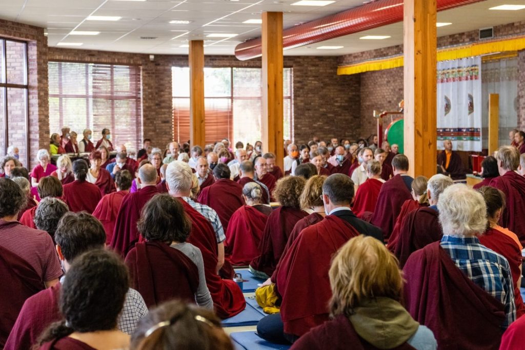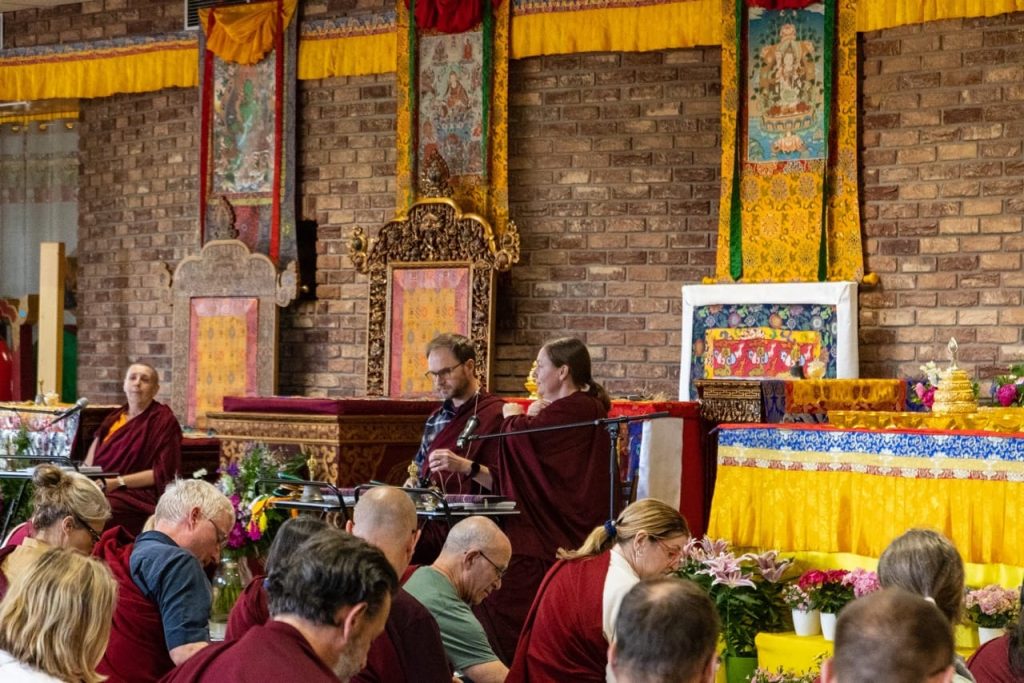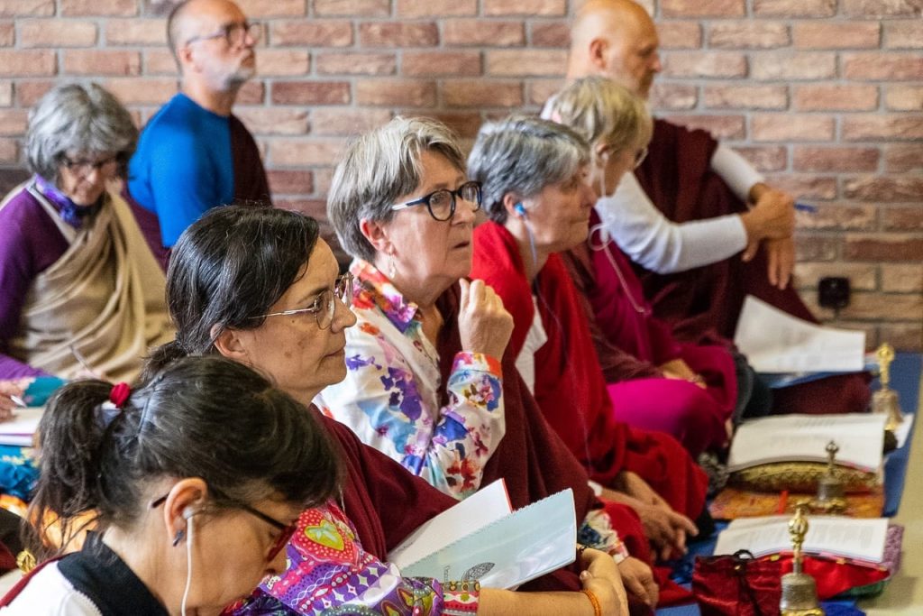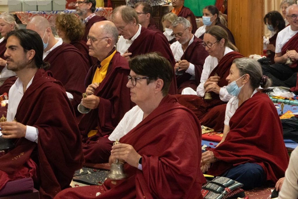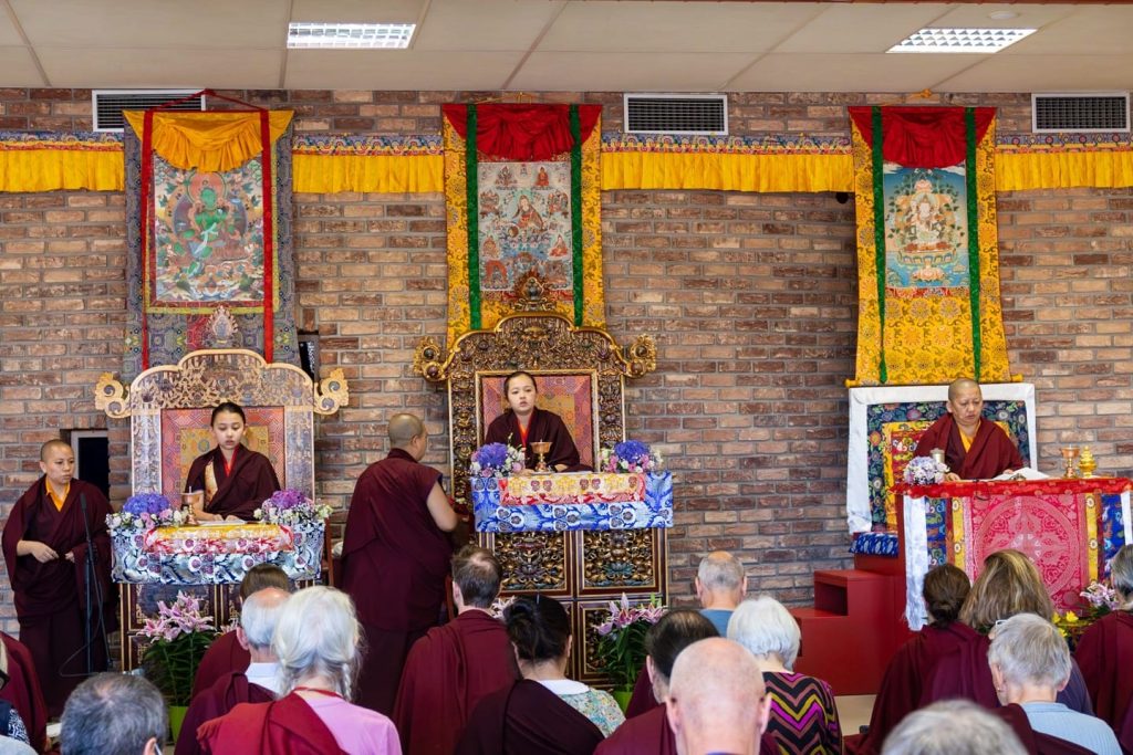 With great kindness, Minling Jetsün Khandro Rinpoche bestowed teachings, oral transmissions, and the Vajrasattva Empowerment to nearly three hundred sangha members from around the world. Monks and nuns from Mindrolling Monastery and Samten Tse Retreat Center made all the preparations for the mandala and the shrine and led the rituals. All sessions and teachings were translated into several languages, including Czech, Spanish, French, German, Polish, and Greek so that all present were able to receive the teachings fully and directly. Furthermore, dharma instructors led review sessions to ensure that all students understood and knew how to do the practices correctly.