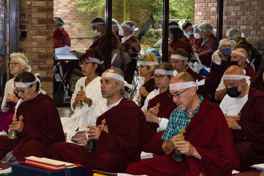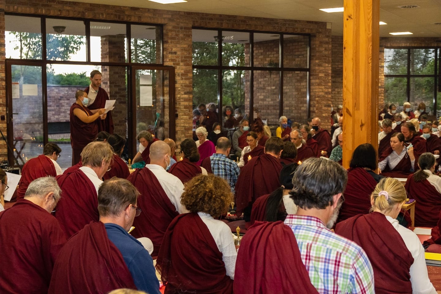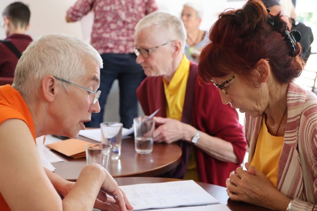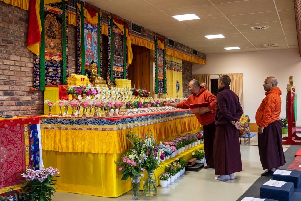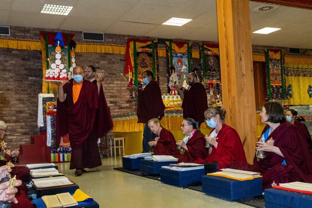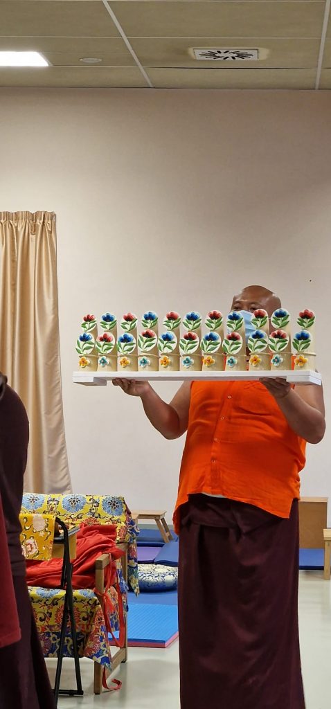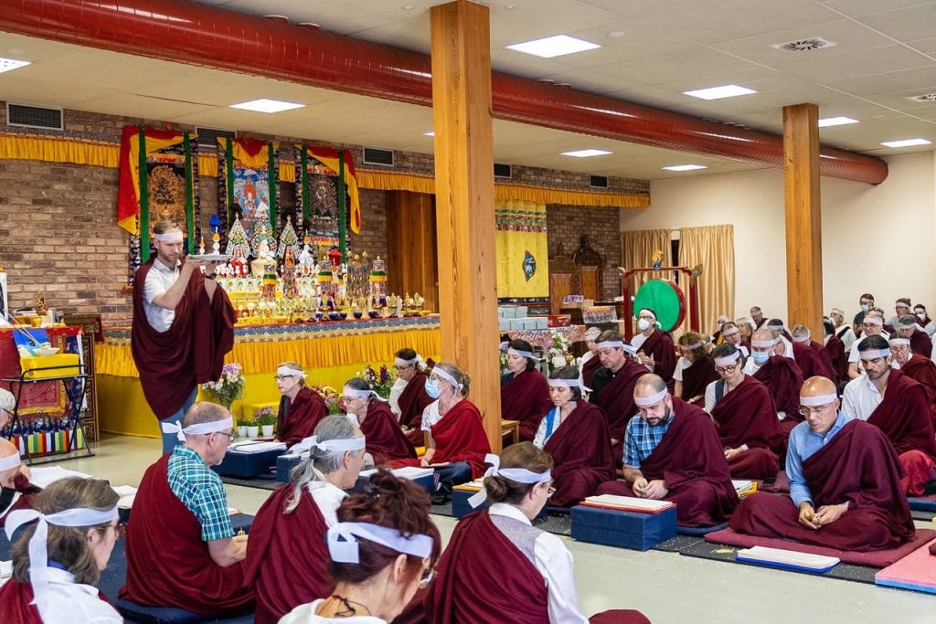 With great kindness, Minling Jetsün Khandro Rinpoche bestowed teachings, oral transmissions, and the Vajrasattva Empowerment to nearly three hundred sangha members from around the world. Monks and nuns from Mindrolling Monastery and Samten Tse Retreat Center made all the preparations for the mandala and the shrine and led the rituals. All sessions and teachings were translated into several languages, including Czech, Spanish, French, German, Polish, and Greek so that all present were able to receive the teachings fully and directly. Furthermore, dharma instructors led review sessions to ensure that all students understood and knew how to do the practices correctly.