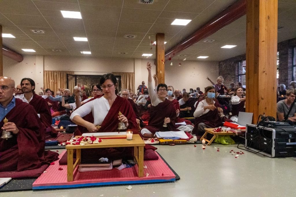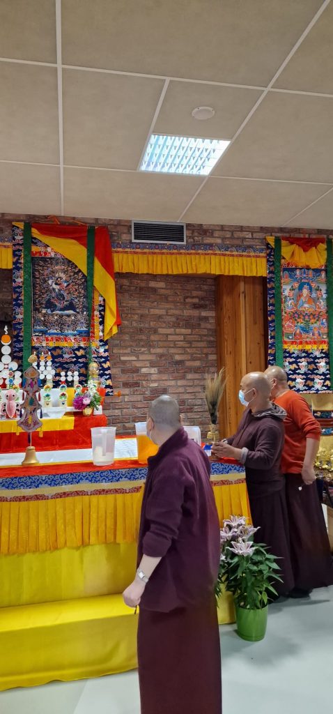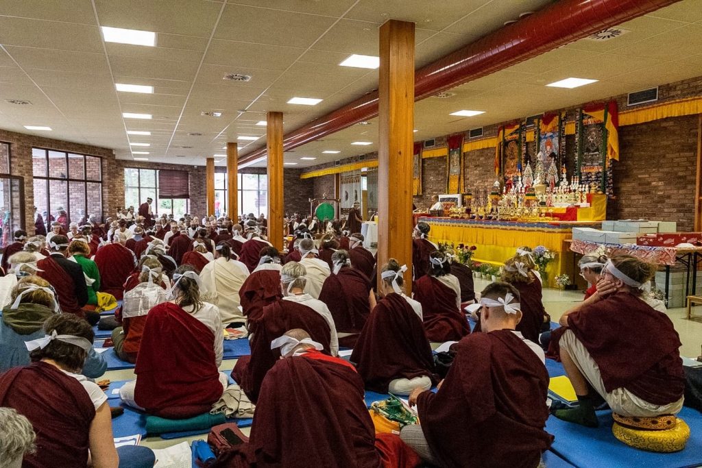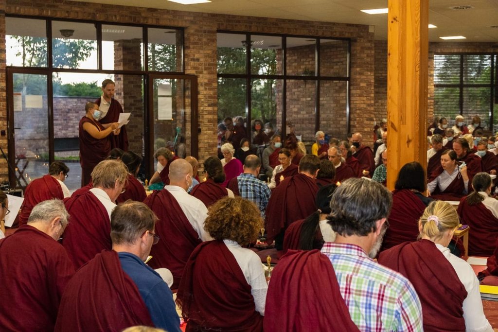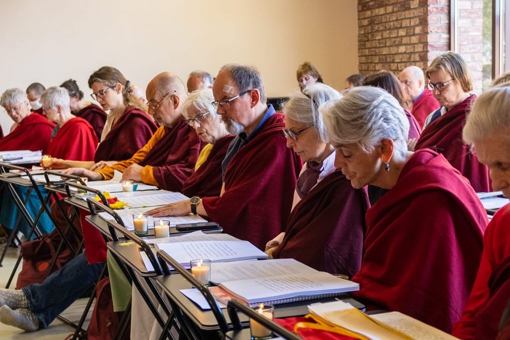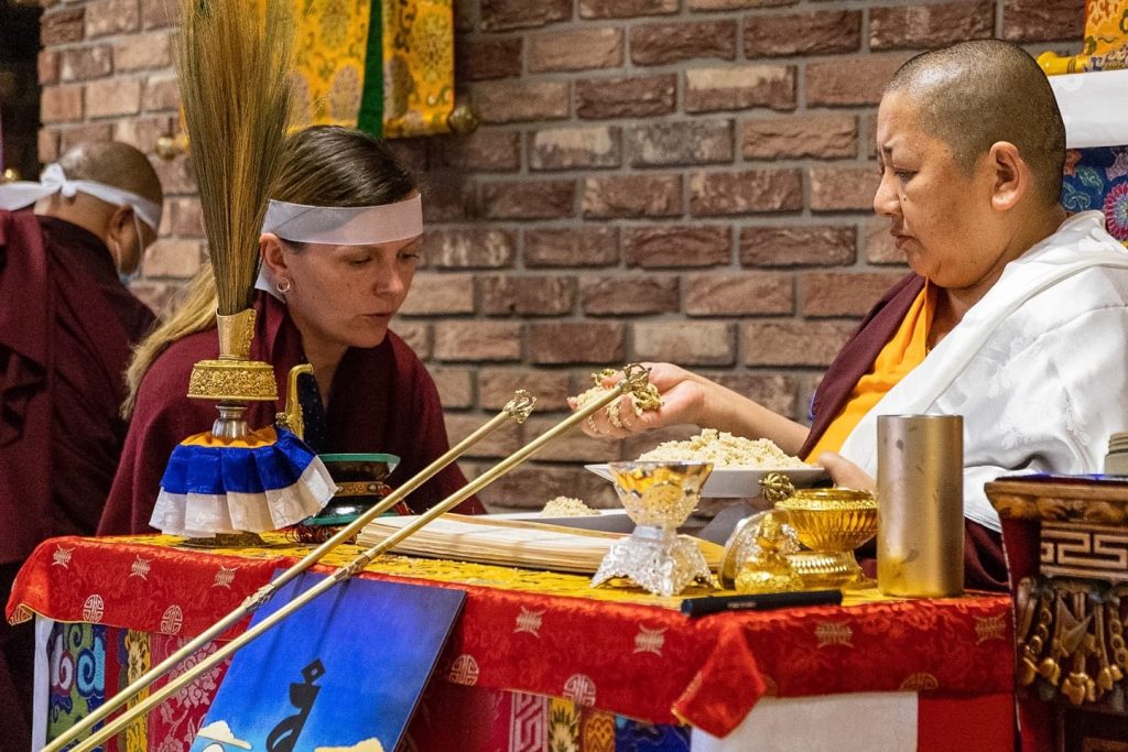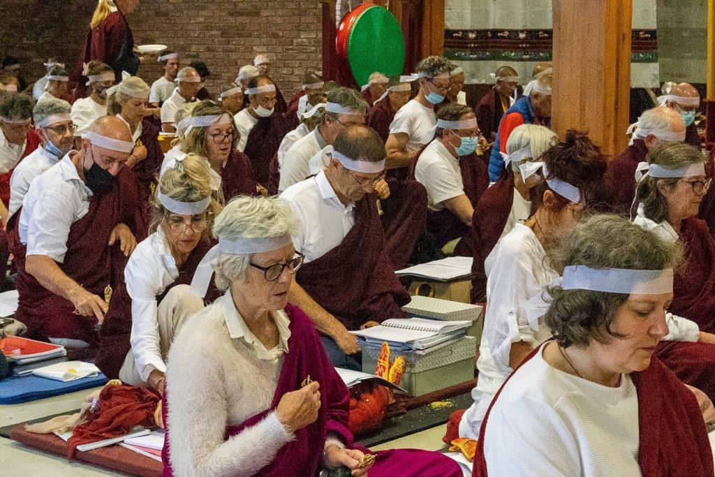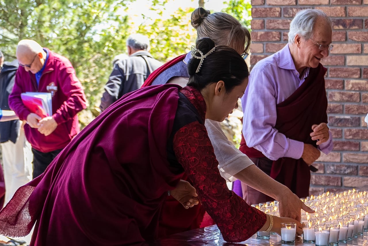 With great kindness, Minling Jetsün Khandro Rinpoche bestowed teachings, oral transmissions, and the Vajrasattva Empowerment to nearly three hundred sangha members from around the world. Monks and nuns from Mindrolling Monastery and Samten Tse Retreat Center made all the preparations for the mandala and the shrine and led the rituals. All sessions and teachings were translated into several languages, including Czech, Spanish, French, German, Polish, and Greek so that all present were able to receive the teachings fully and directly. Furthermore, dharma instructors led review sessions to ensure that all students understood and knew how to do the practices correctly.